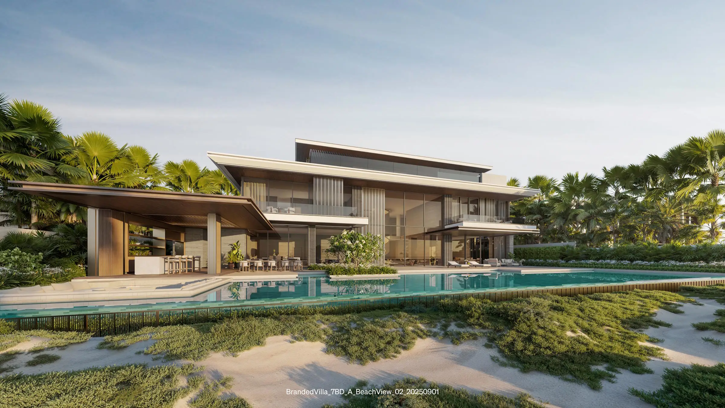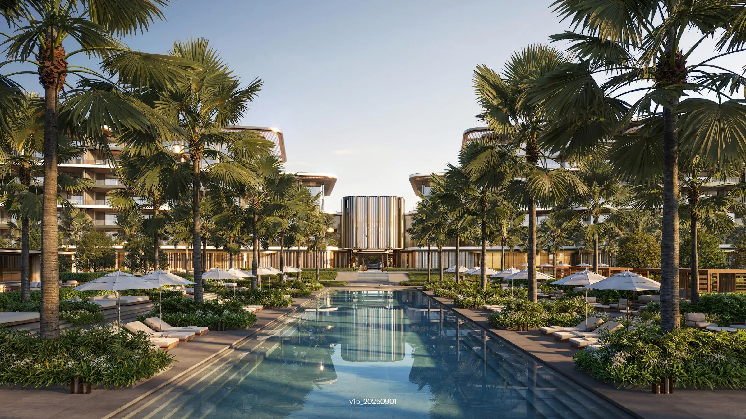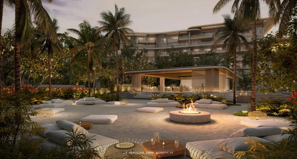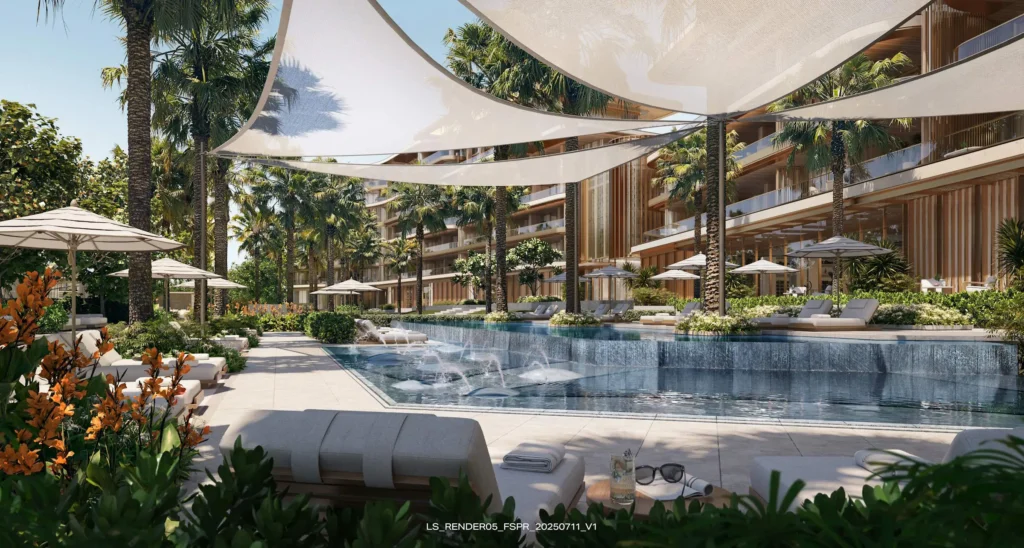 The development features direct beach access, a private beach lounge, multiple swimming pools (adult, kids, and lap pools), and a state-of-the-art spa with thermo and treatment rooms.