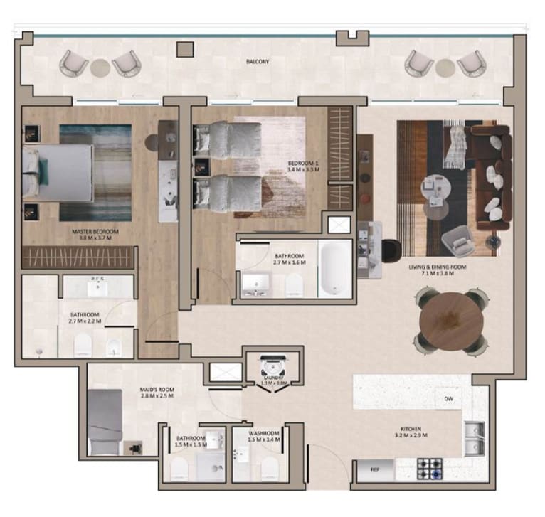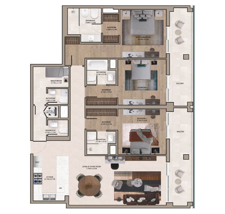 Properties in the complex are presented by 2-3 bedroom apartments and 3-bedroom duplexes. The starting price for a 2-bedroom residence in the project is AED 2.1M (USD 572K). The developer offers a 30/70 payment plan.