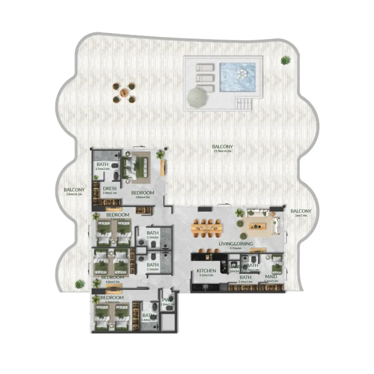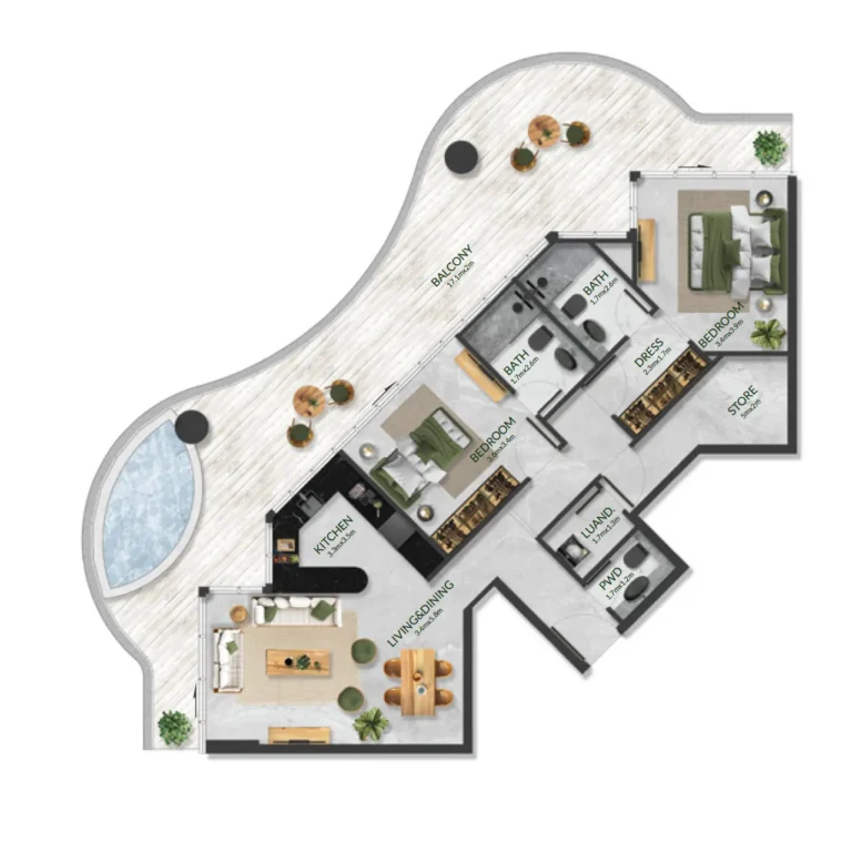Perfectly landscaped podium connects residents to green spaces, pool areas, and seating spots, creating a harmonious outdoor environment that balances community interaction with private moments of relaxation.