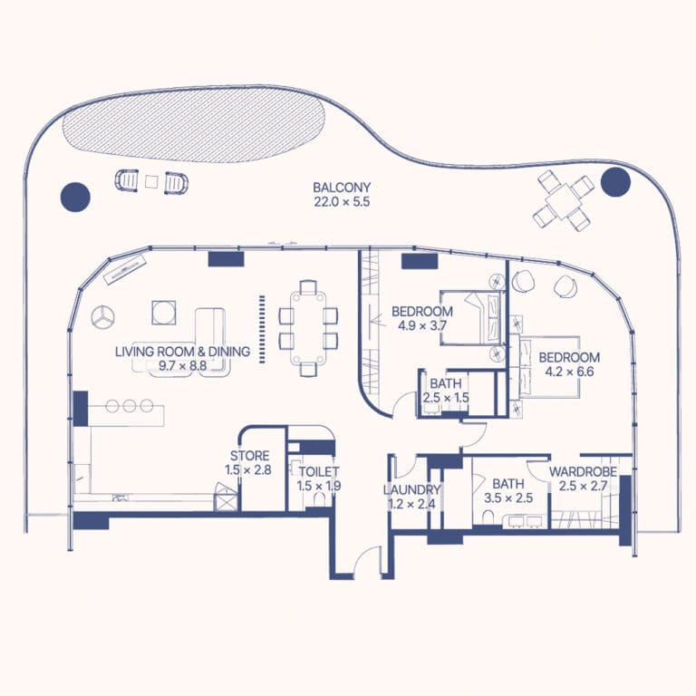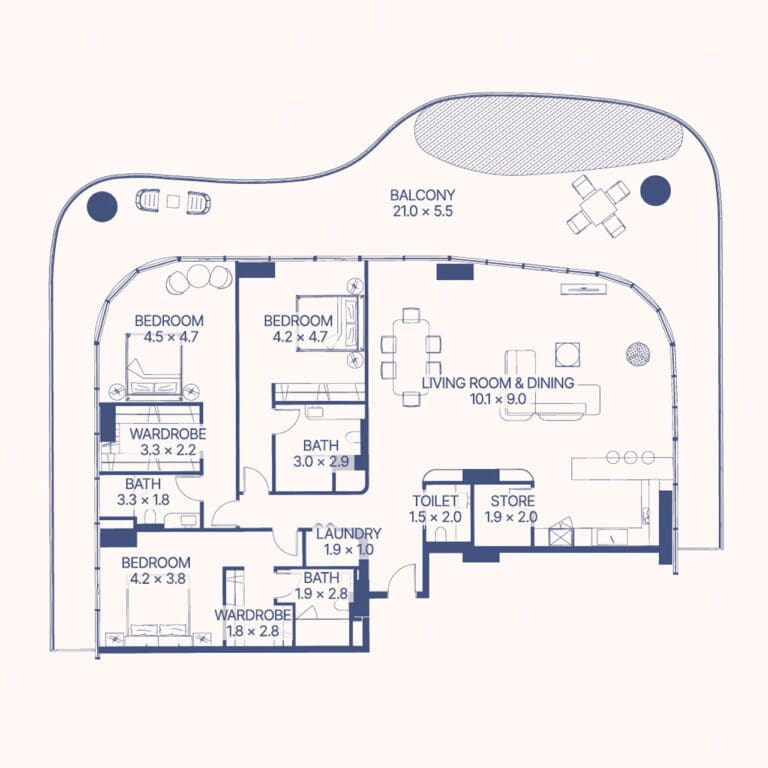 Choose from studios, 1-, 2-, and 3-bedroom apartments — many featuring private terrace pools, high-end interiors, and floor-to-ceiling windows. The residences offer true hotel-style living, with 24/7 housekeeping, concierge, valet services, and curated dining, wellness, and leisure amenities.