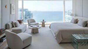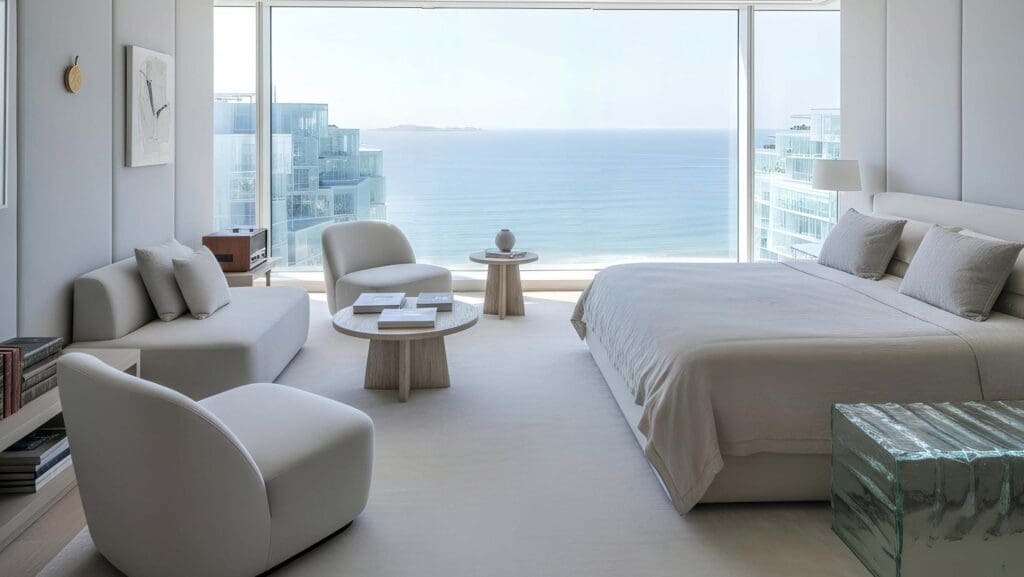 Ice Beach offers 608 residences: 1-bedroom apartments in Mini, Standard, and Luxury configurations, 2-bedroom duplexes, and 6 exclusive 3-bedroom Sky Villas with private elevators. Ceiling heights reach 3.8 m in standard units and 7 m in duplexes.