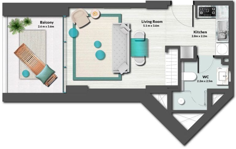 The area of the residences ranges from 391 sq. ft to 3,807 sq. ft. Enjoy picturesque panoramas of the sea and Al Marjan Island right from the comfort of your own home.
