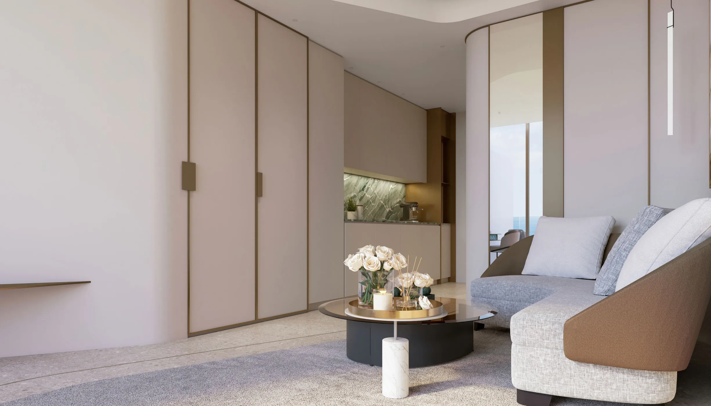 Palazzo Tissoli consists of studios and one-bedroom residences, fully furnished with floor-to-ceiling glazing, walk-in closets, and bespoke interiors. Studio units are approximately 470 sq.ft, while one-bedroom units are about 1,000 sq.ft.