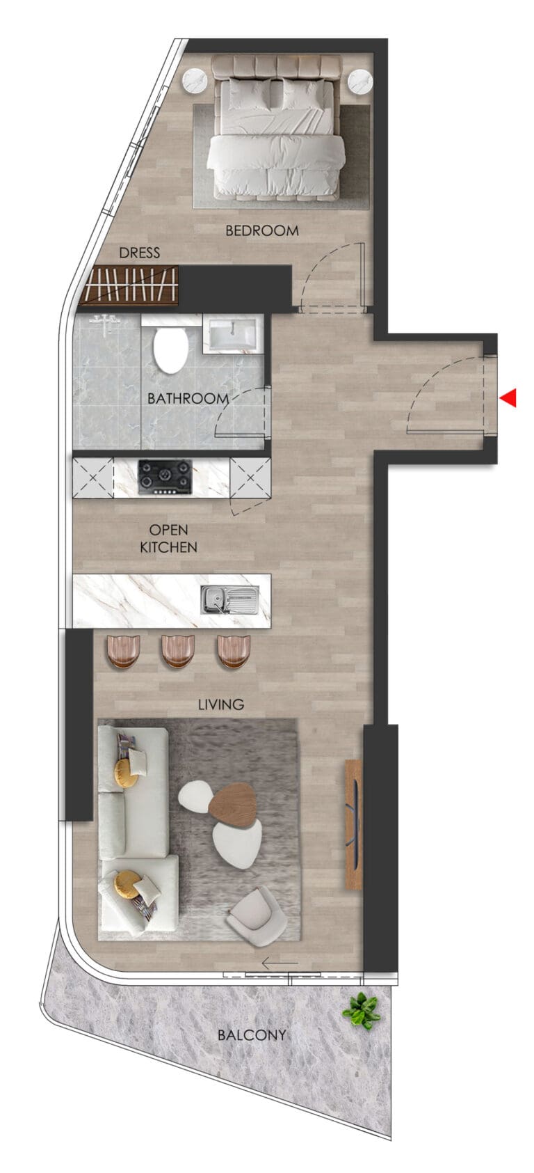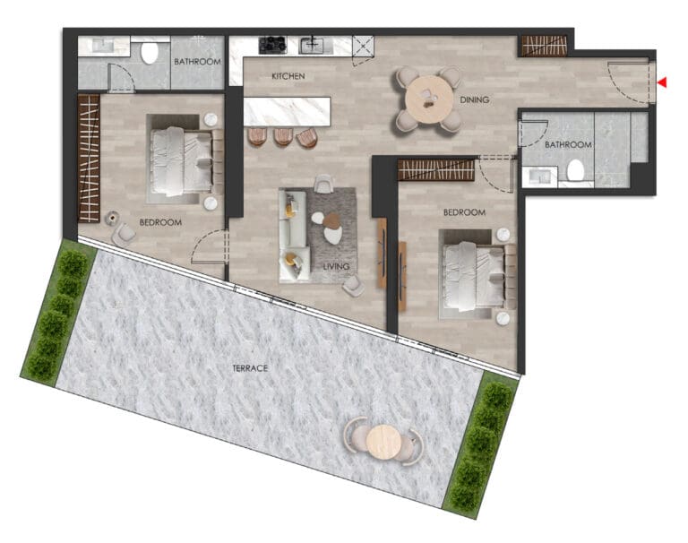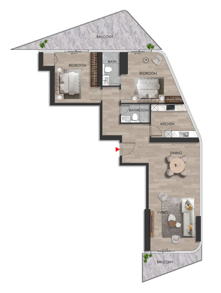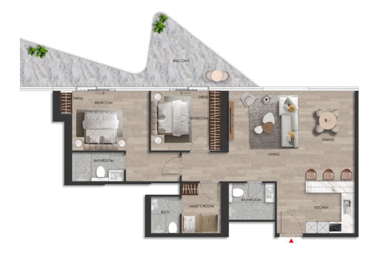 The property sizes range from 479 sq. ft to 1,709 sq. ft. Layouts include balconies/terraces with stunning views of the sea and casino or the island surroundings. Some two-bedroom apartments also feature additional staff rooms.