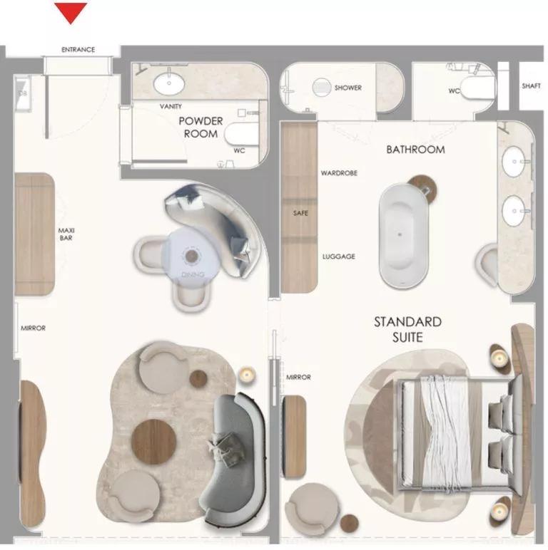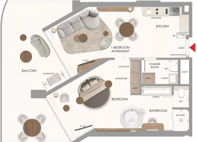 The branded complex will be managed by Ushuaïa Unexpected Hotels and Residences, part of the award-winning Spanish chain – The Palladium Hotel Group. Interested buyers will be able to choose from an exquisite collection of 319 five-star hotel suites and 103 private residences, ranging from standard rooms, junior suites, suites and premium suites, as well as studios and 1-2 bedroom apartments. The properties vary in size from 459 sq. ft to 2,545 sq. ft. All of the units come fully furnished.