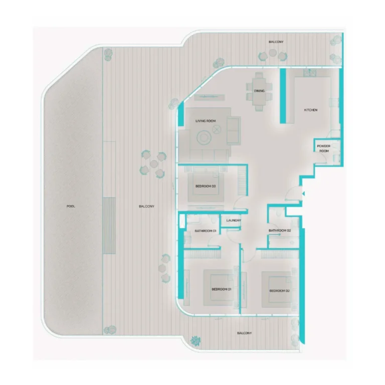 1BR–3BR residences include 2–3 bathrooms, a guest powder room, and a laundry area, with selected layouts offering walk-in wardrobes and private pools. 3BR penthouses feature a private pool and staff room with bathroom, while G+3 villas and 5BR mansions include private gardens, home gyms, studies, technical and storage rooms; all homes are fully furnished and equipped with smart home systems.
