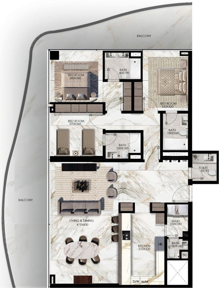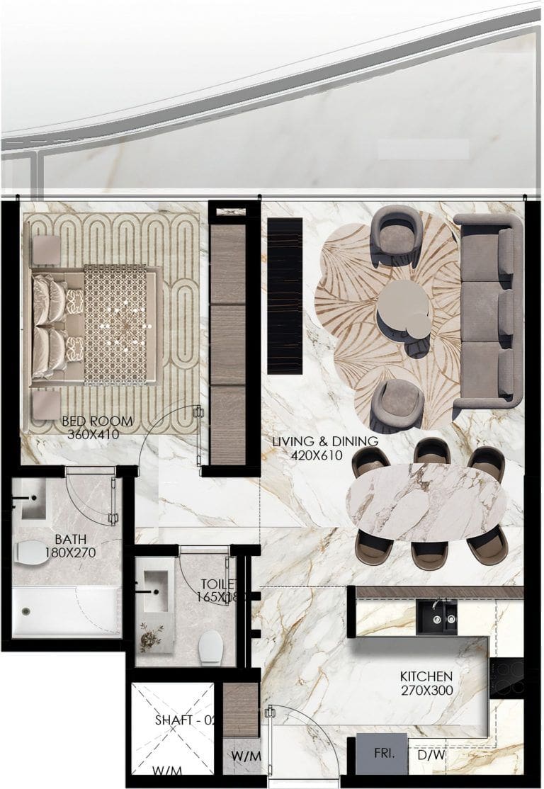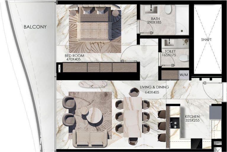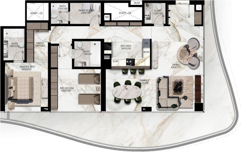 Elie Saab Waterfront features a stunning collection of 1-3 bedroom apartments and a single luxury penthouse that occupies the entire top floor. The minimum area of the residences start at 1,184 sq. ft. Interior design is done in the signature style of Elie Saab, using contrasting colours from pearl to cherry and crimson tones. Premium materials were chosen for finishes; fine wood and natural stone add elegance throughout. In the residences, panoramic windows offer captivating views of the island's landscape, canal and picturesque promenade.