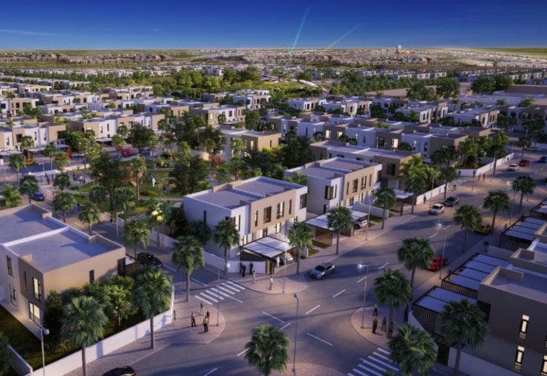 Nasma Residences is the most developed complex in the area and consists of 1,100 properties. Some of the units have already been commissioned, while others are still under construction. The community has an abundance of green areas with cycling and jogging paths, and residents have easy access to a large shopping mall. Two- and five-bedroom villas and townhouses range in size from 1,290 sq. ft. to 4,700 sq. ft. and range in price from AED 995,000 (USD 270,000) to AED 3,400,000 (USD 926,000).