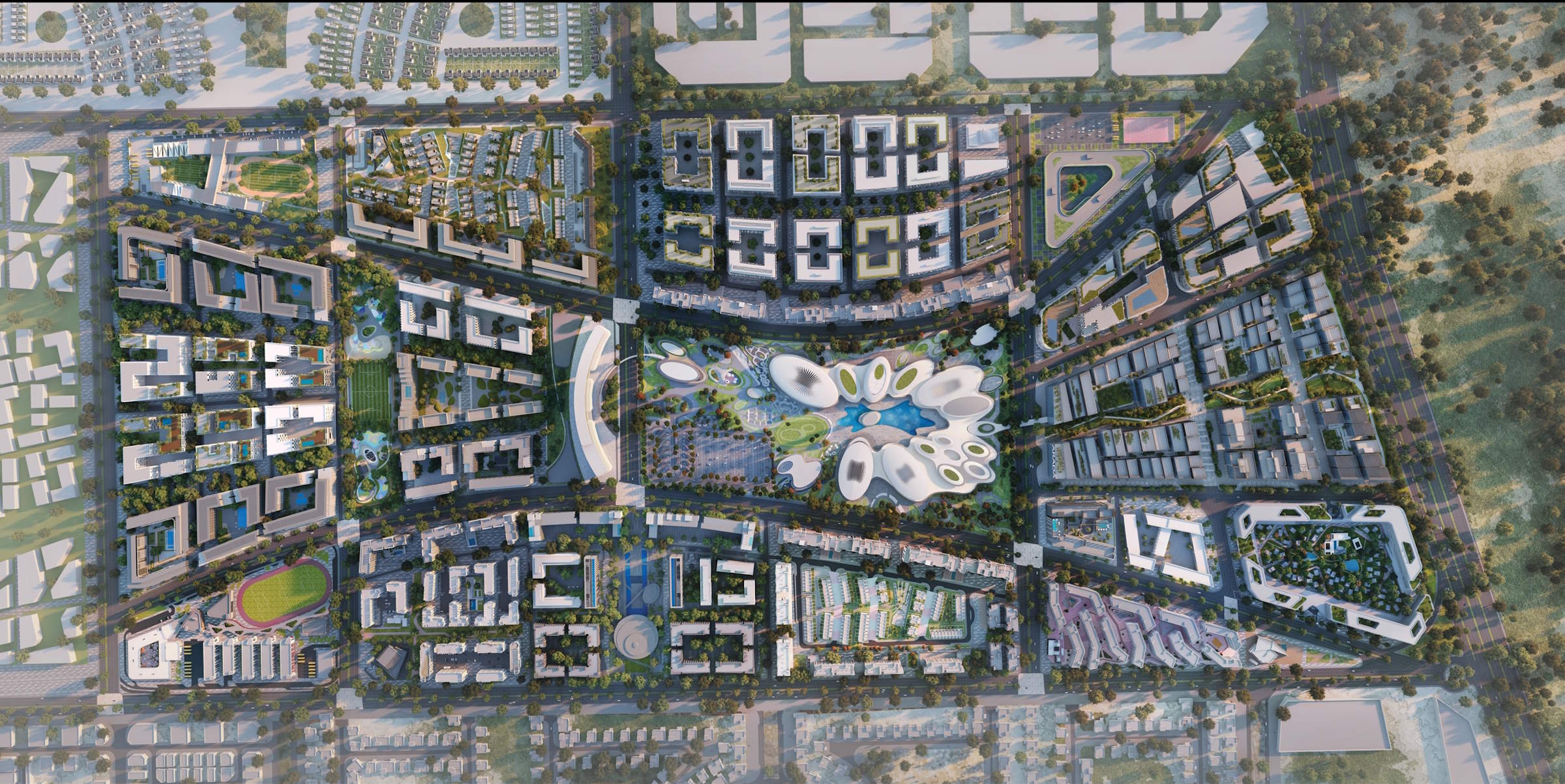 Modern 1–3 bedroom apartments nestled between a landscaped residents' park and the vibrant West Boulevard. Smart home features and premium white goods included as standard. Steps from Madar Mall by Zaha Hadid Architects. From AED 899,000.
