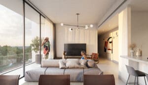 The development features exquisite 1- to 3-bedroom apartments equipped with a smart home system.