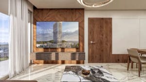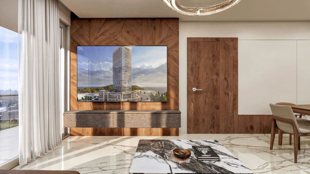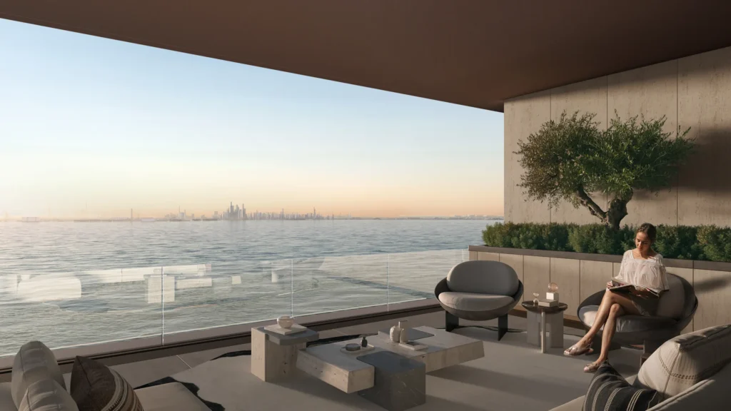 تراس مصمم بشكل طبيعي على السطح يمنح السكان إطلالات بانورامية على البحر وأفق المدينة، ويشكّل مساحة مشتركة للاسترخاء والفعاليات الاجتماعية.