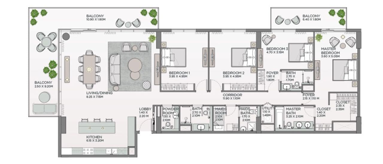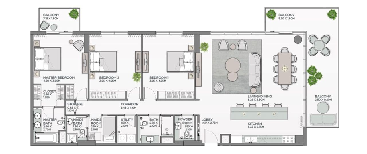 سيضم كل عقار واحدة أو أكثر من الشرفات مع إطلالة خلابة على الحديقة الفاتنة المحيطة، بالإضافة إلى غرفة خادمة مع حمام ملحق في العقارات المكونة من 3-4 غرف نوم وفي مساكن محددة من غرفتي نوم. تتراوح مساحة الشقق في لوريل بين 680 و 3,200 قدم مربع.