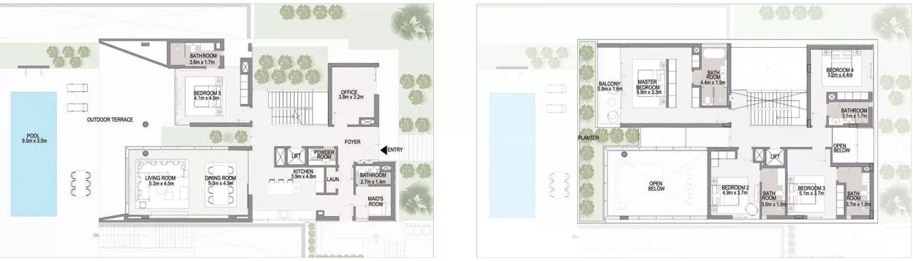 تتراوح مساحات أرض المساكن المخصصة بين 7,537 – 13,261 قدم مربع، في حين أن إجمالي المساحة المبنية يتراوح بين 6,901 – 7,535 قدم مربع.