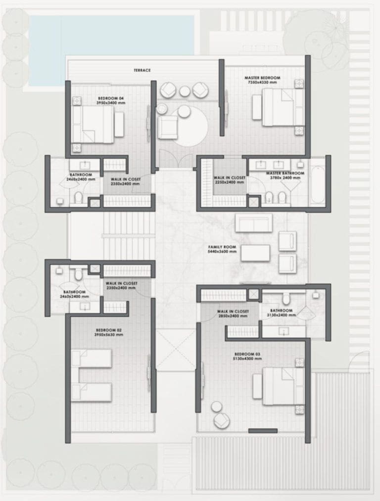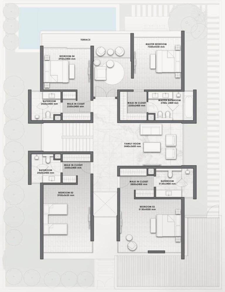 تمتد المساكن ذات العلامات التجارية على طابقين، بمساحة كل منزل 4,158 أو 4,341 قدم مربع. تتميز المخططات المصممة بدقة بمجموعة من وسائل الراحة مثل حمام السباحة وسكن الخادمة وغرفة السائق والمصعد والمرأب وخزائن الملابس الكبيرة والشرفة ومساحة التخزين.