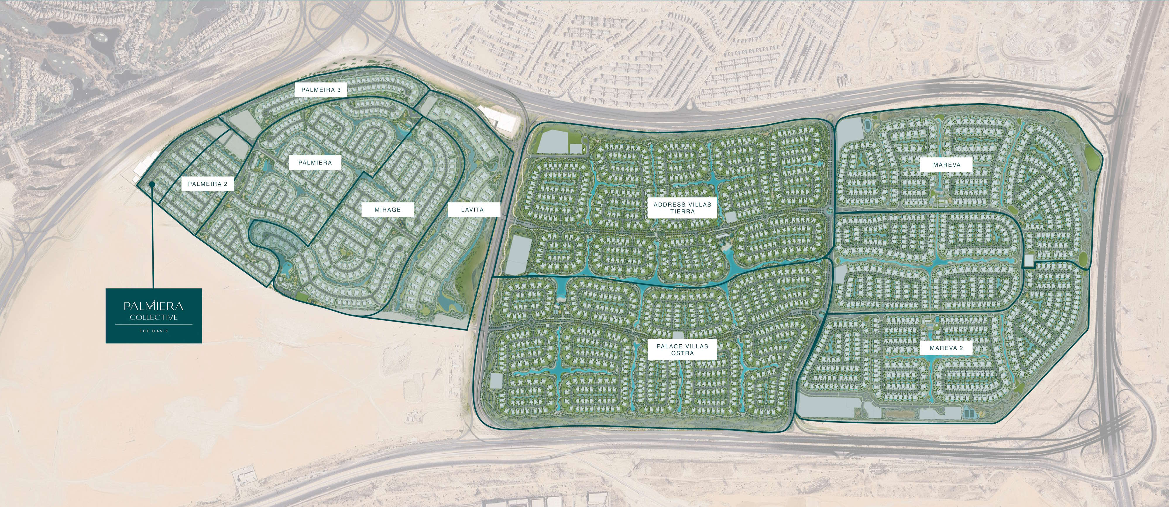 يوفّر بالميرا كوليكتيف في ذا أويسيس من إعمار مجموعة محدودة جداً من 38 فيلا راقية من أربع غرف نوم مطلة على المياه، تتوزّع حول بحيرات صالحة للسباحة وقنوات مترابطة وشاطئ خاص. تتميّز الفلل بوجود أقبية، وتراسات على السطح، ومسابح خاصة، ومصاعد داخلية، ومطبخين، بالإضافة إلى غرف للعمالة المنزلية. تقع الفلل على قطع أراضٍ بمتوسط 8,800 قدم²، مع مساحات مبنية تتراوح بين 7,880 و8,099 قدم²، وتتوفر بثلاثة أنماط معمارية مختلفة: الحواف المائلة، المعاصر، والكلاسيكي. تبدأ الأسعار من 16.5 مليون درهم إماراتي مع خطة سداد 80/20، ومن المقرر التسليم في فبراير 2029.