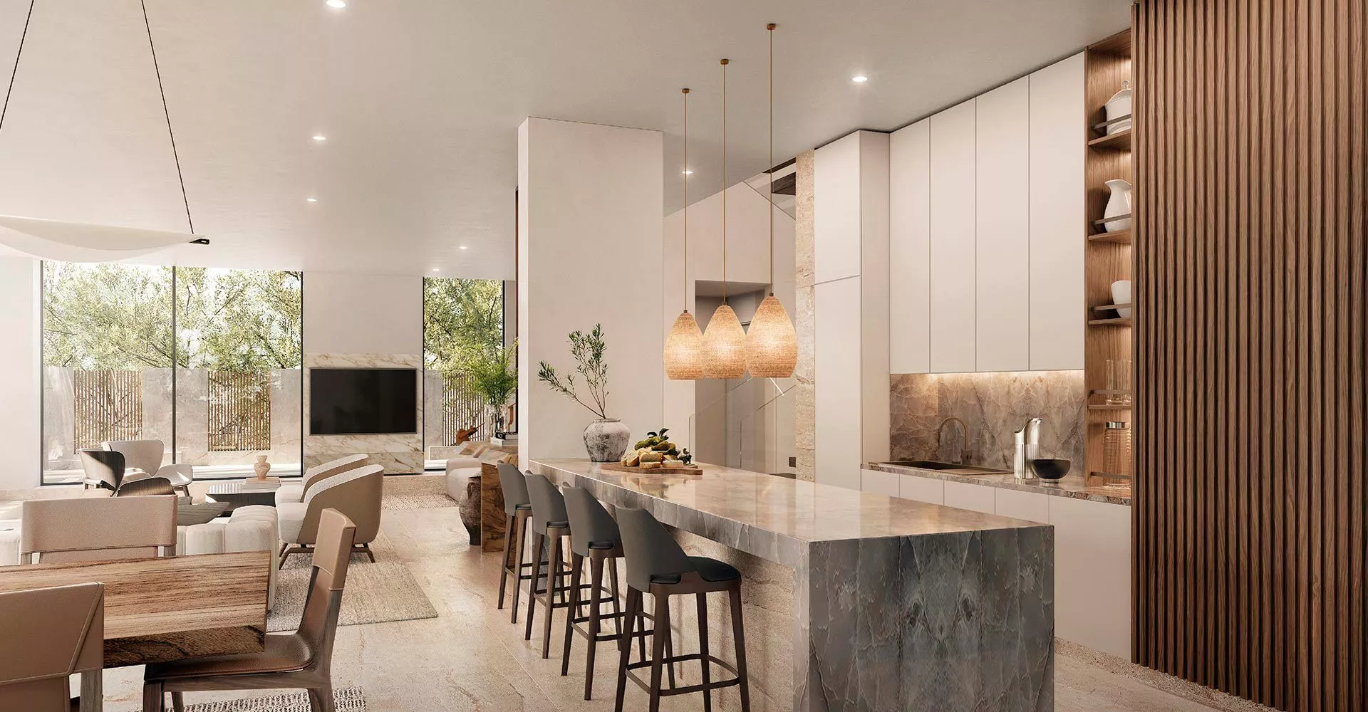 يشمل تصميم المنازل في المنطقة أرضيات رخامية ذات جودة عالية وأرضيات خشبية في غرف النوم. تتوفر مواقف واسعة للسيارات مع باب مرآب ومصاعد منزلية داخلية في كل جراند فيلا. تحتوي فلل علايا على مدخل مزدوج الارتفاع، ونوافذ منزلقة ممتدة من الأرض حتى السقف للاتصال الداخلي والخارجي، وأجنحة رئيسية واسعة مع خزائن ملابس مجهزة بالكامل، وتبريد هواء مبتكر ومطابخ أوروبية مع أفضل الأجهزة الكهربائية. يوفر كل منزل خيارين من المناظر الطبيعية، إما مع حديقة أو مسبح خاص. تشمل خيارات ترقية المناظر الطبيعية تروبيكال ريتريت وأنماط البحر الأبيض المتوسط.