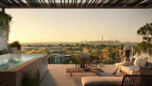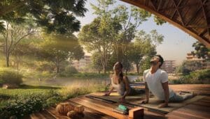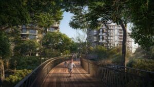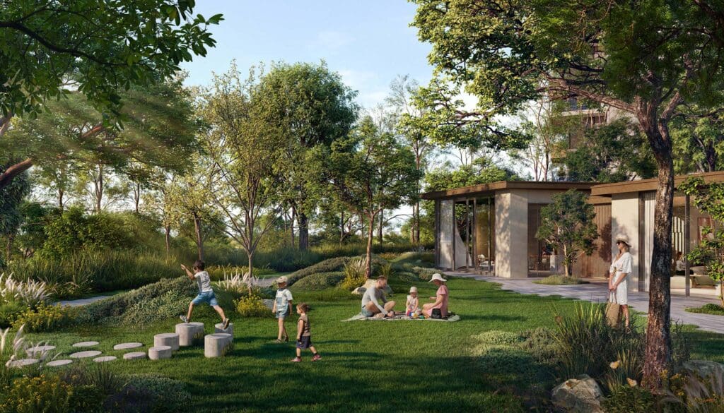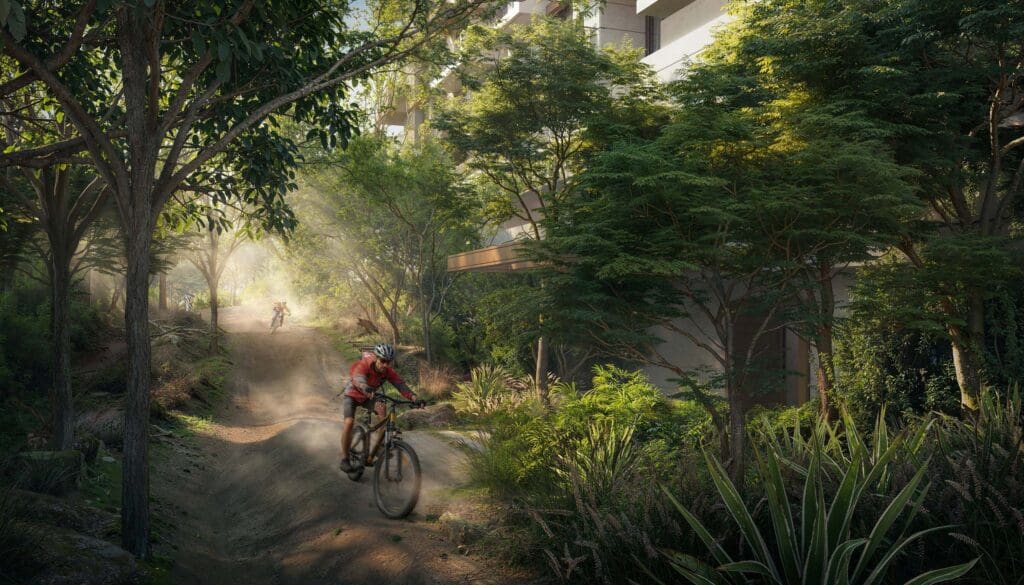 تخلق أحواض السباحة المدمجة بسلاسة على حافة الغابة واحة هادئة حيث يمكن للسكان الاسترخاء وتجديد النشاط. ستوفر هذه الأحواض تجربة سباحة فريدة من نوعها بينما تحيط بها المساحات الخضراء الطبيعية وأشجار الغاف.