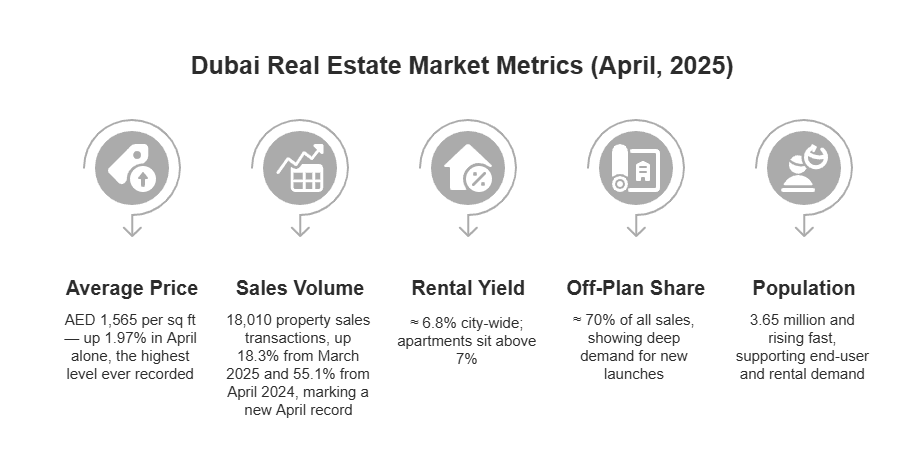 - Dubai’s real estate market hit AED 1,565 per sq ft (up 1.97%) in April 2025, with 18,010 sales (+55.1% YoY) and 6.8% yields.