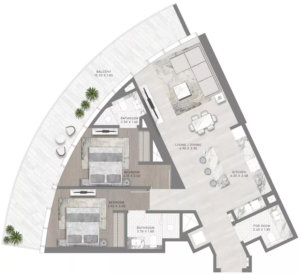 The master developer offers a convenient 70/30 payment plan, which includes a 20% booking fee. During construction and upon estimated completion in Q1 2028, you must pay 50% and 30%, respectively.