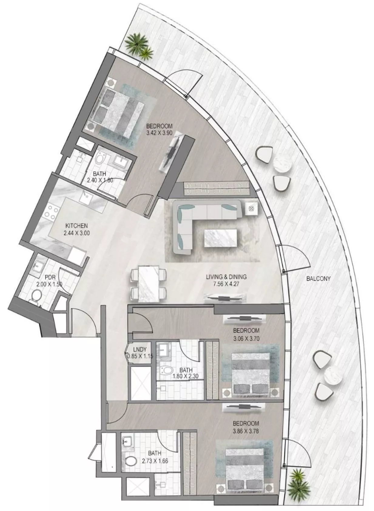 As of January 2024, the initial price for a 1-bedroom property in Altitude de GRISOGONO stands at AED 3.3M (USD 898K). The starting price for a duplex is AED 8.86M (USD 2.4M).