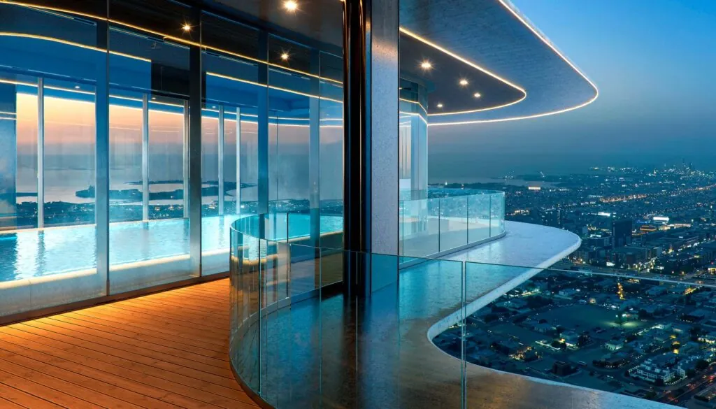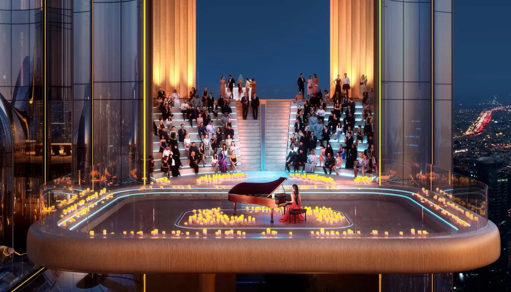An elite wellness suite with a high-performance gym, yoga and pilates studios, steam rooms, saunas, ice baths, and a gorgeous sky pool with a view of Dubai's skyline will be available to business executives and professionals.