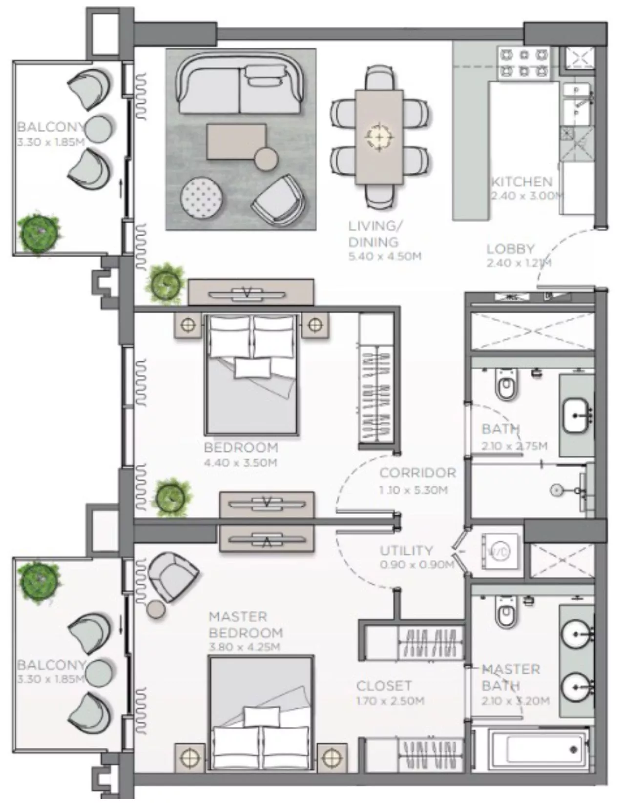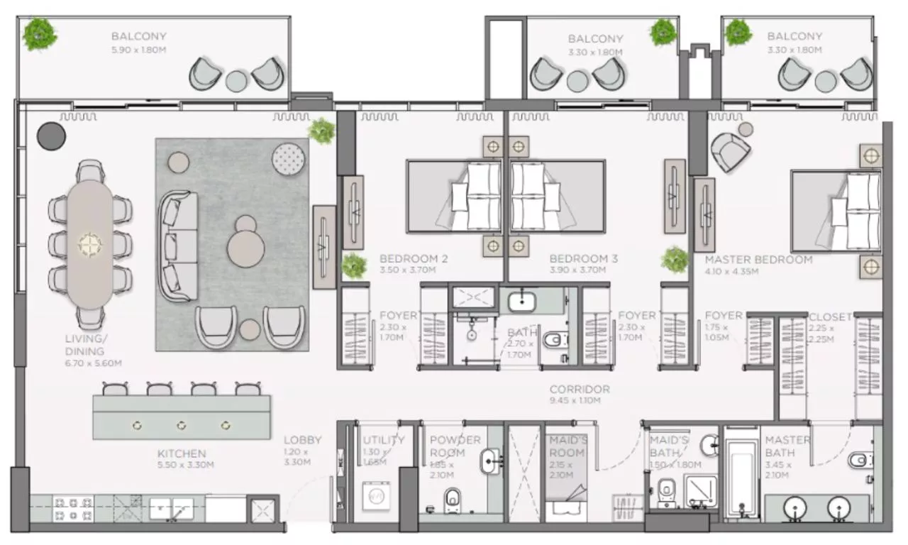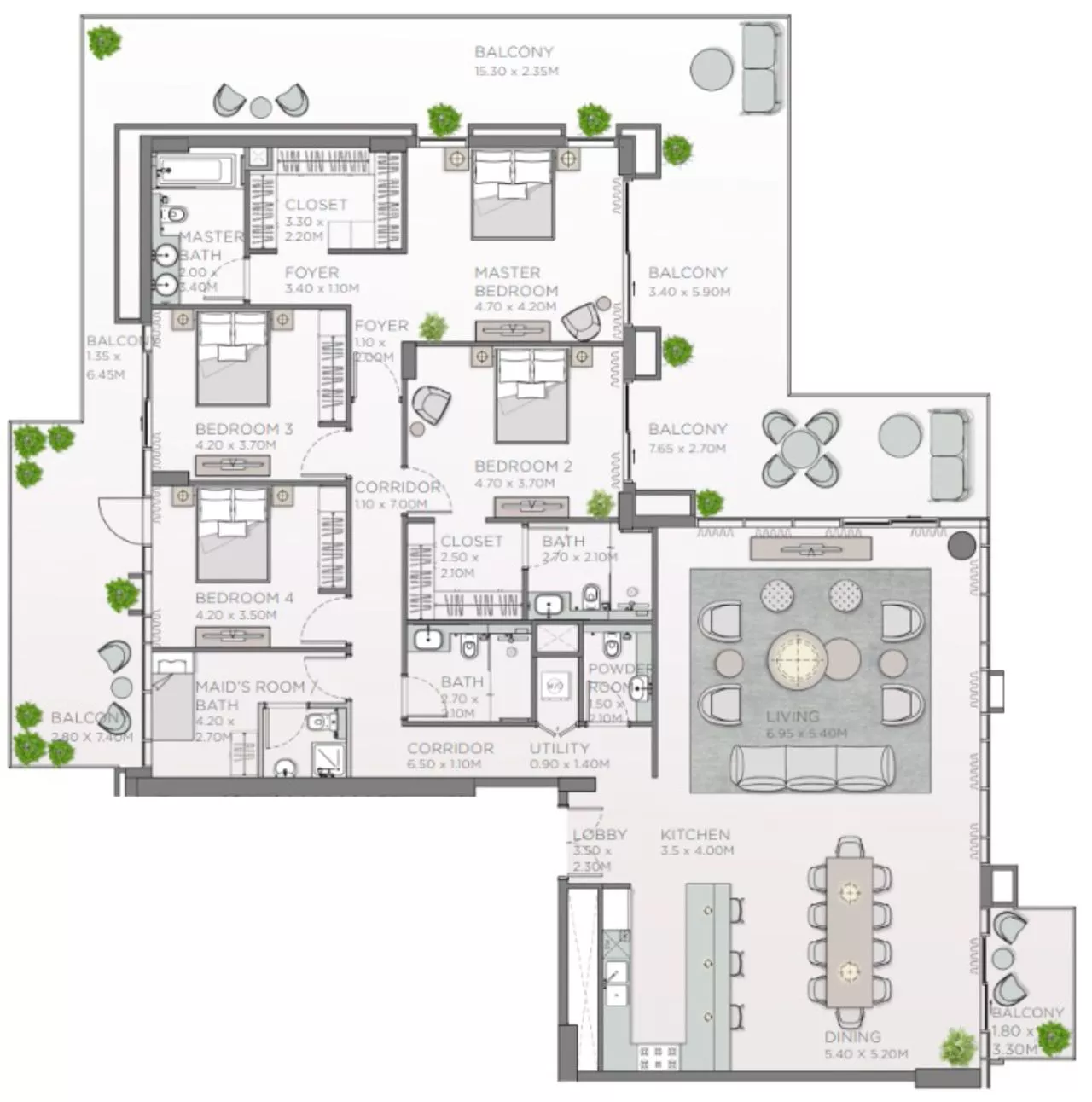 Each apartment in Thyme will come with 1 or more balconies, a utility room and a lobby, whilst select layouts will feature a closet. Additionally, owners of 3-4 bedroom properties will have a maid’s room at their full disposal. The development will overlook a luscious park with an abundance of greenery whilst still being set within the heart of the vibrant neighbourhood of City Walk.
