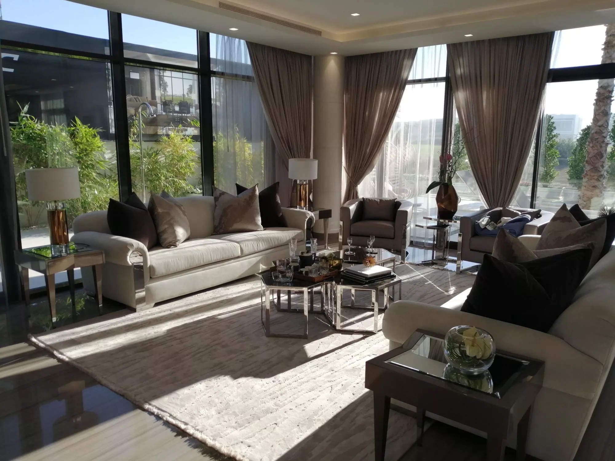 Trump Estates was built by DAMAC Properties. Units have a contemporary style with a strict minimalist design using materials in bronze, cream, gold, and black with matte and glossy finishes. Villas have three, four, five, and six bedrooms, and they range in size from 2,500 sq. ft (232 sq. m) to 12,500 sq. ft (1,161 sq. m). Units feature large living rooms, terraces, walk-in closets, panoramic windows, modern appliances, and housekeeping accommodations, and they are furnished with comfortable and stylish items from quality manufacturers.