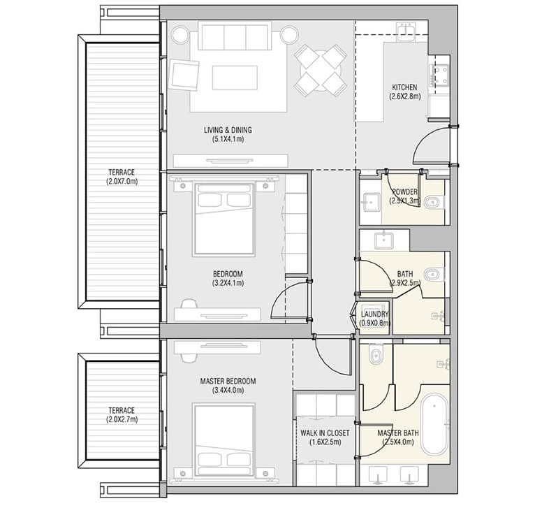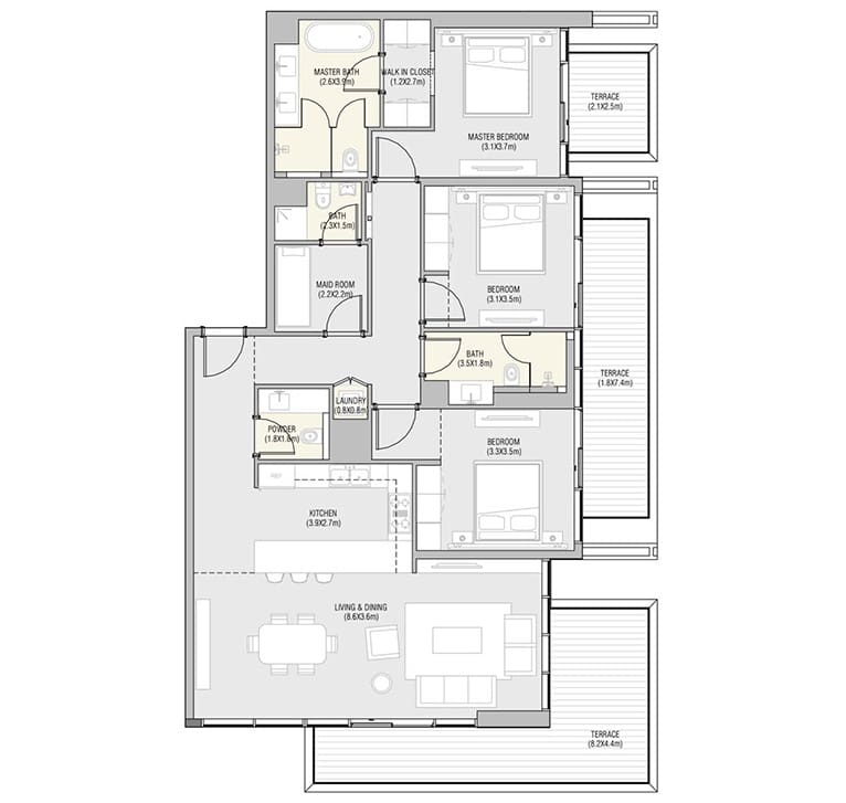 Die 121 voll möblierten 1-, 2- und 3-Schlafzimmer-Residenzen sind geprägt von zeitgenössischem Design, hochwertigen Ausführungen und beeindruckenden Ausblicken. Bewohner profitieren von der mühelosen Anbindung an die kulturellen Wahrzeichen Abu Dhabis und genießen gleichzeitig die Ruhe der exklusiven Strandlage.