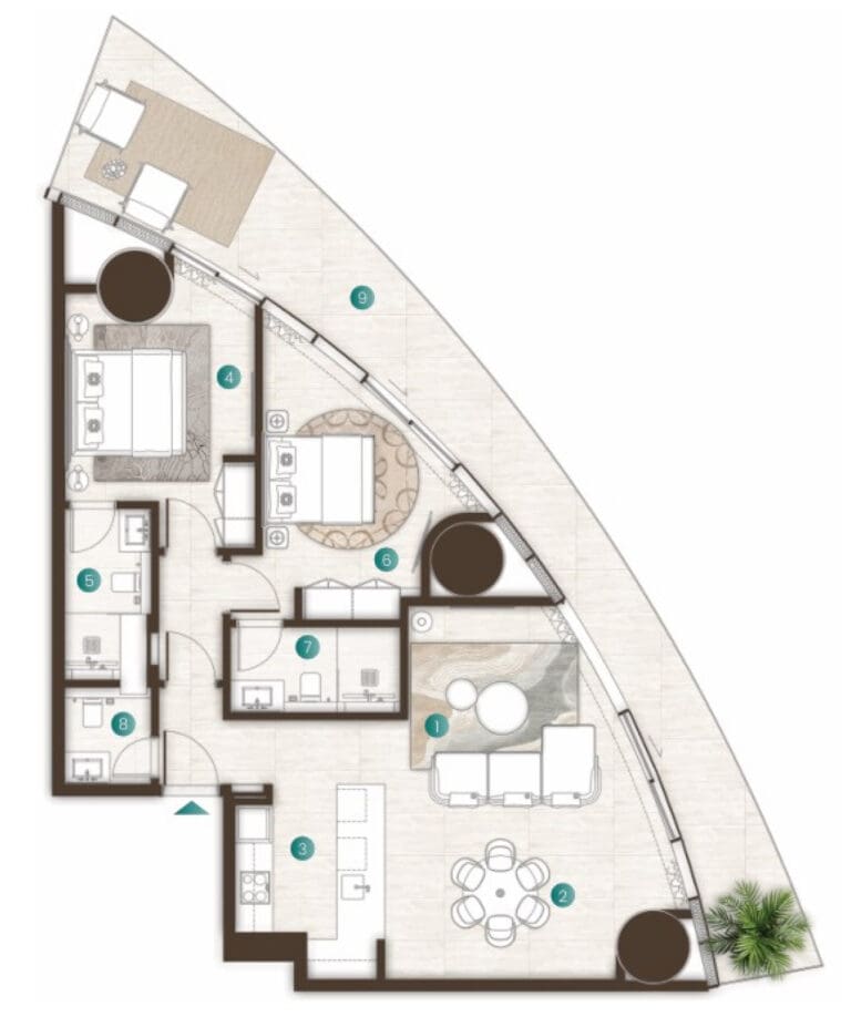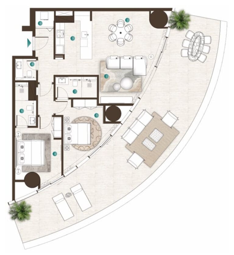 Der exklusive direkte Strandzugang des Komplexes ermöglicht den Bewohnern einen mühelosen Zugang zur unberührten Küste und sorgt für ein unvergleichliches Wohnerlebnis direkt am Wasser. Mit atemberaubendem Blick auf das azurblaue Meer genießen die Bewohner einen erstklassigen Lebensstil in einer der begehrtesten Lagen der VAE und erleben den Luxus eines privaten Rückzugsortes am Meer.