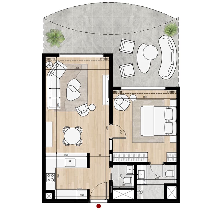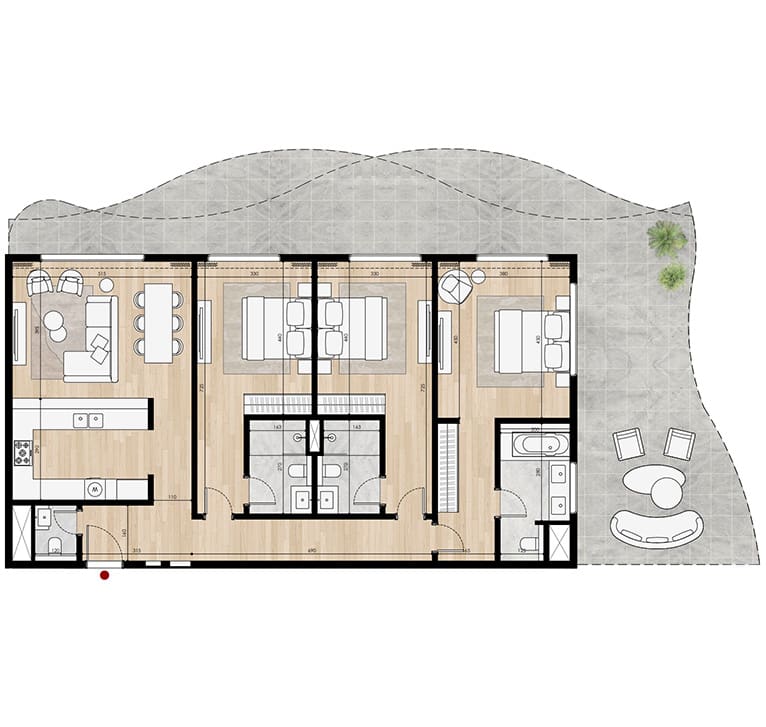Insgesamt entstehen hier 810 Wohneinheiten, darunter nur 48 begehrte Studios als Limited Edition in allen Türmen. Die Apartments reichen von 64 bis 144 m², verfügen über voll ausgestattete Küchen, smarte Infrastruktur und moderne, offene Grundrisse. Die Wohnungen sind zwar unmöbliert, überzeugen aber mit einem eleganten Resort-Charakter, klaren Linien und lichtdurchfluteten Räumen mit Meerblick. Die meisten Einheiten bieten private Balkone mit Aussicht auf den Arabischen Golf.