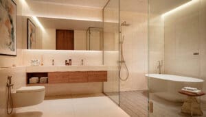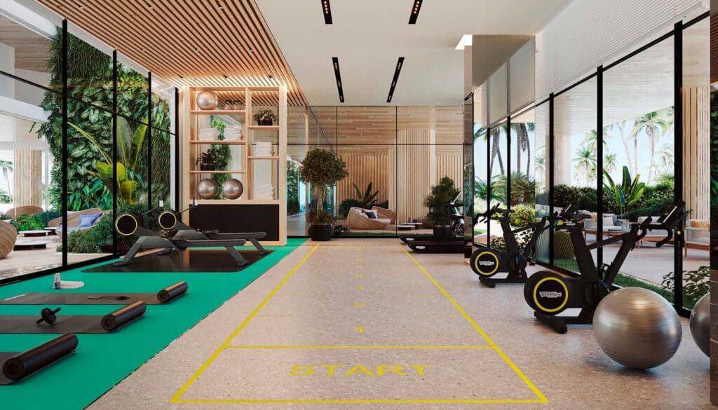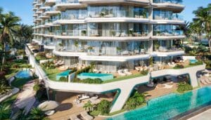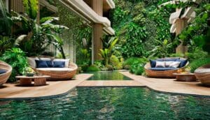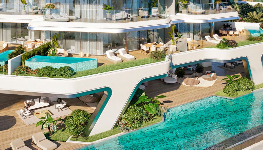 Im Herzen der Wohnanlage entfaltet sich eine tropische Oase mit zwei üppigen Innenhöfen, die das harmonische Zusammenspiel von Innen- und Außenbereichen zelebrieren. Reflektierende Teiche und kaskadenartige Gärten erstrecken sich beeindruckende 47 Meter in die Höhe und bieten einen friedlichen Rückzugsort, inspiriert von der natürlichen Schönheit der Umgebung.