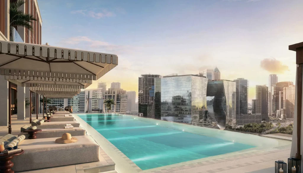 Ein beheizter Infinity-Pool mit freiem Blick auf den Dubai Water Canal und die Skyline, inklusive Burj Khalifa.