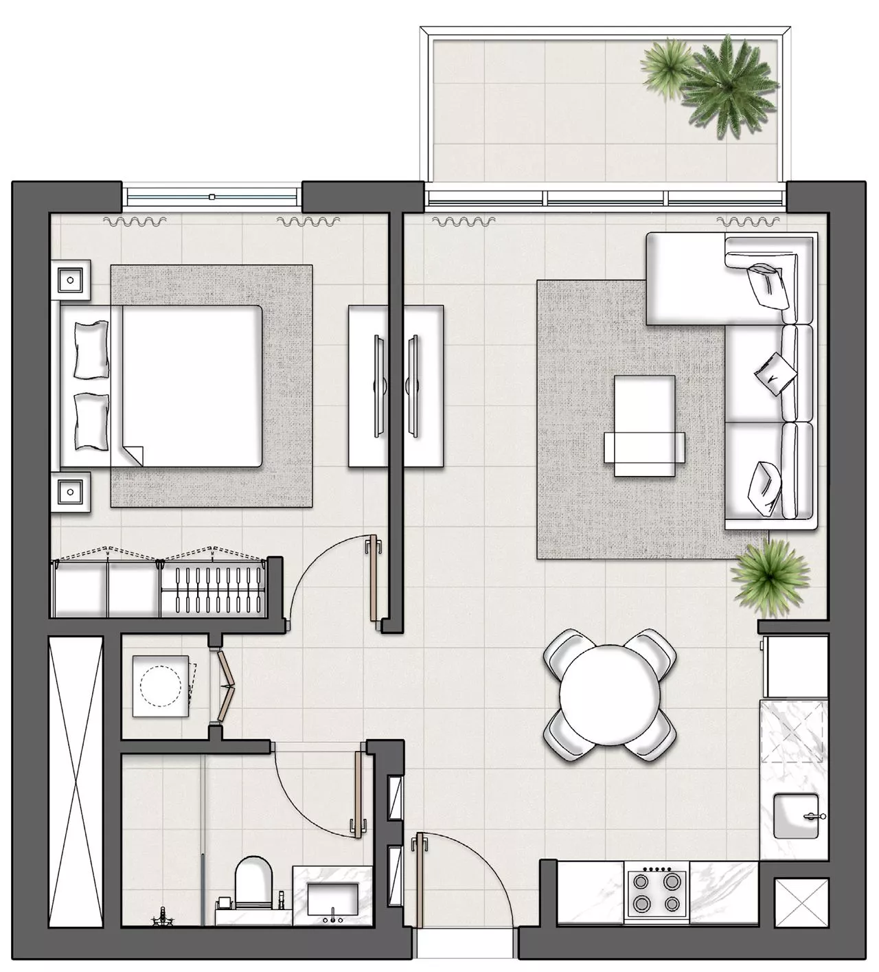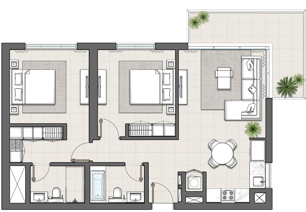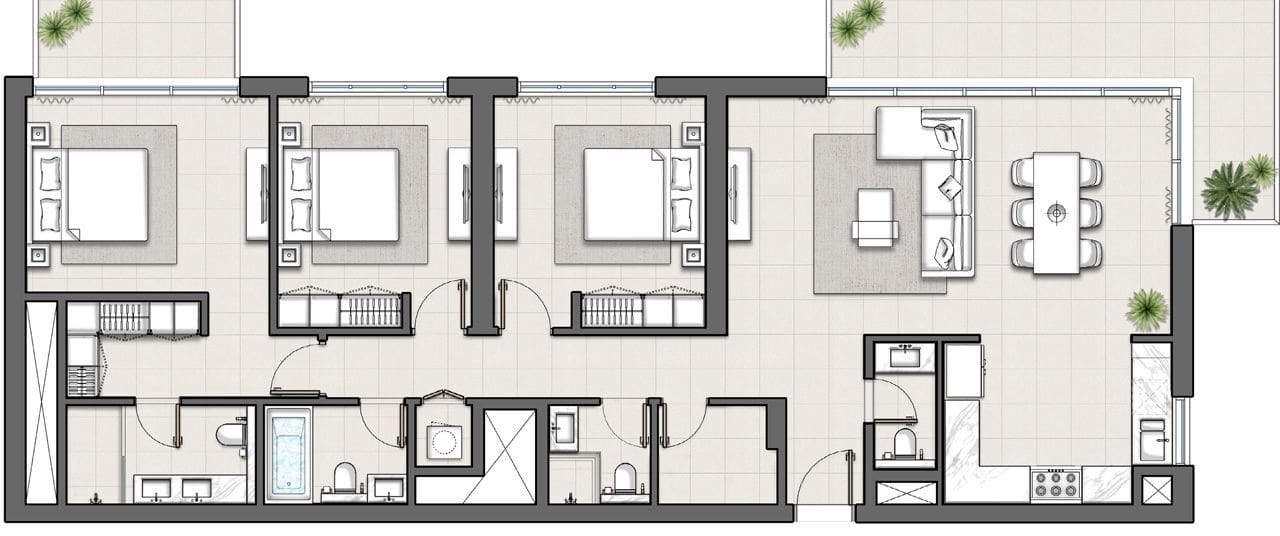 Die Apartments sind zwischen 63 und 165 m2 groß und verfügen über einen oder zwei Balkone mit Blick auf üppige Grünflächen. Die Vollgeschosswohnungen sind zwischen 1.847 und 1.863 m2 groß.