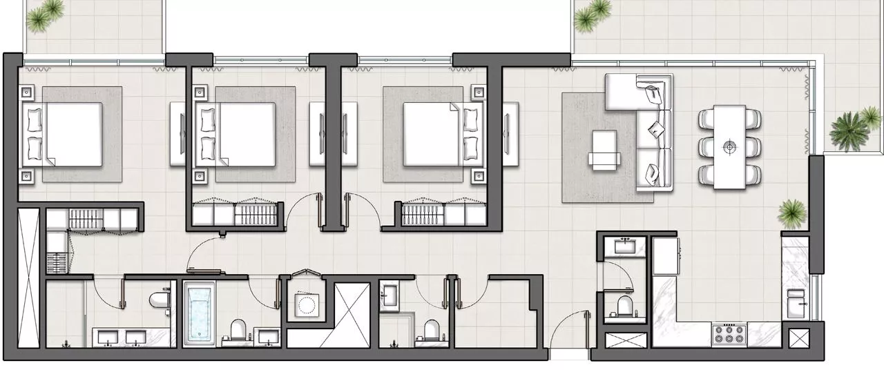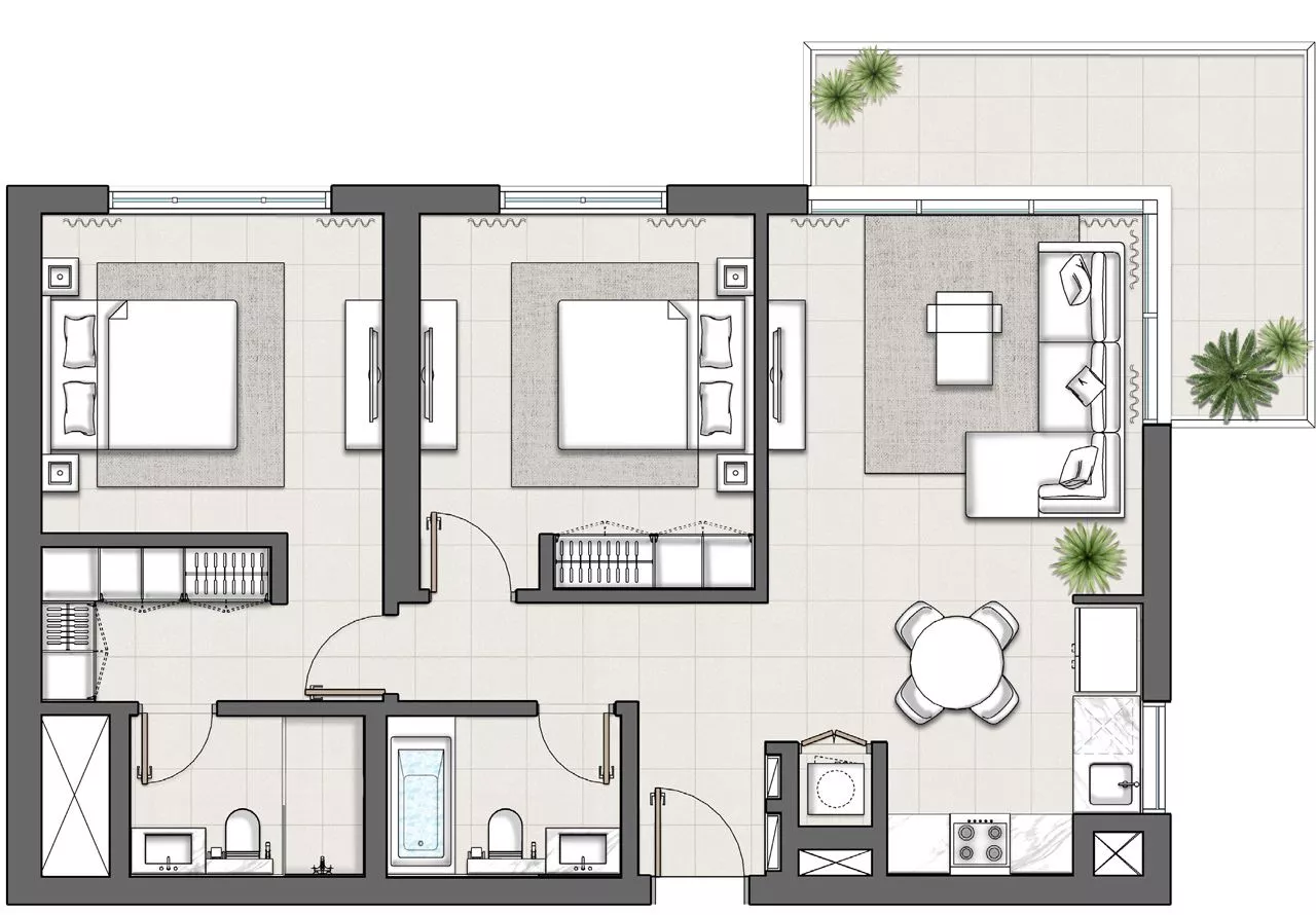 Wie bereits erwähnt, bietet Hills Park Vollgeschosse an, die den Eigentümern die Möglichkeit geben, den Raum nach ihren persönlichen Bedürfnissen zu gestalten. Es ist auch möglich, eine Immobilie für die private Nutzung zu erwerben und den Rest der Wohnungen mit Hilfe einer Immobilienverwaltung zu vermieten, was ein beträchtliches fortlaufendes Einkommen generieren kann. Eine andere Möglichkeit ist, die ganze Etage oder die Hälfte davon umzubauen und ein großzügiges Penthouse mit größtmöglicher Privatsphäre zu schaffen.