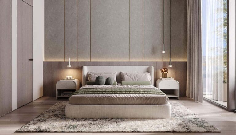 Bodentiefe Fenster und großzügige Balkone eröffnen atemberaubende Ausblicke auf die umliegenden Gärten und die Skyline der Stadt. Die Innenausstattung setzt auf ruhige, natürliche Farbtöne und schafft so eine friedliche, harmonische Wohnatmosphäre.