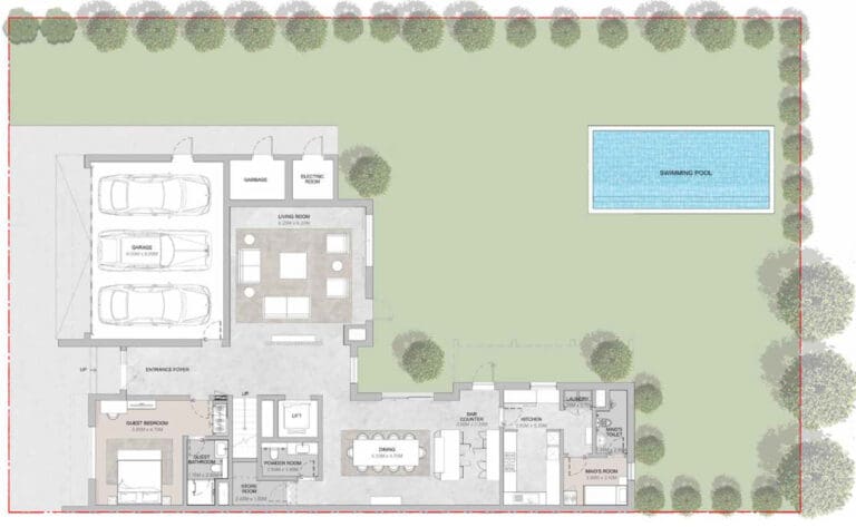 Den Bewohnern stehen zwei überdachte Parkplätze für Villen mit 4 bis 5 Schlafzimmern und drei für Villen mit 6 Schlafzimmern zur Verfügung. Für umweltbewusste Hausbesitzer gibt es außerdem praktische Ladestationen für Elektrofahrzeuge.