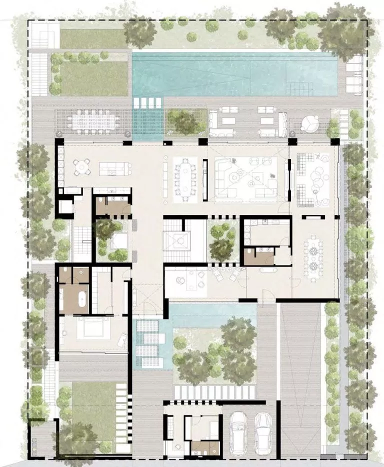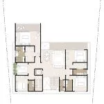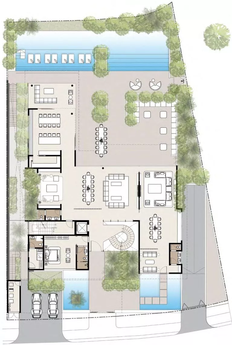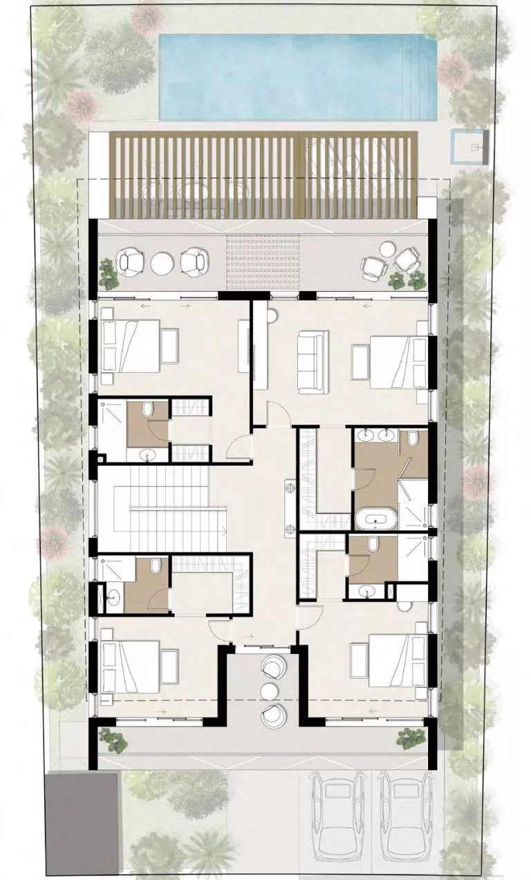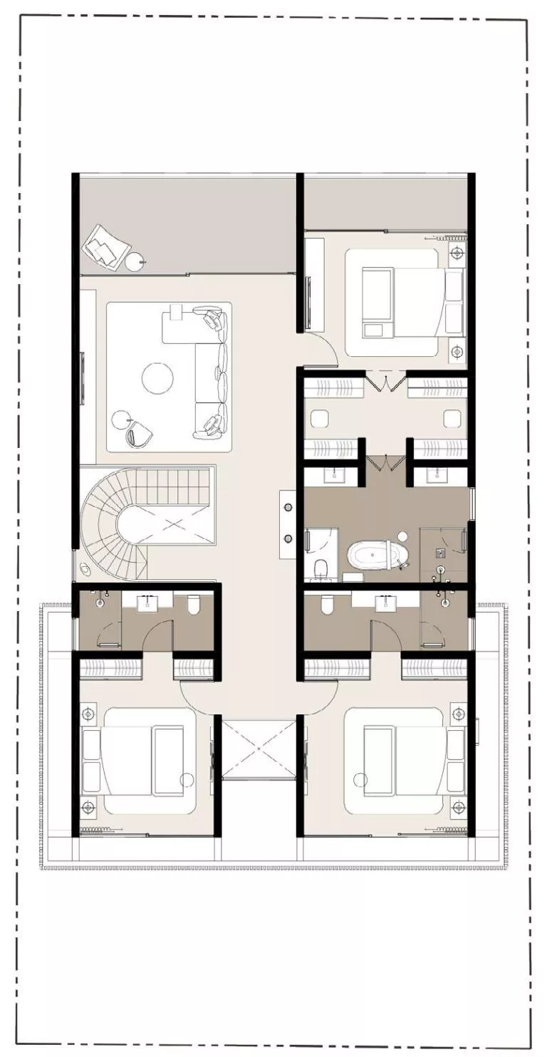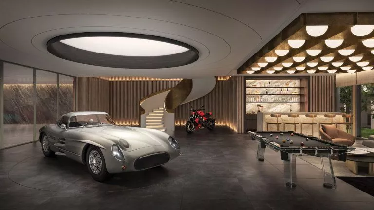 Dank der verschiedenen Grundrisse können Sie sich für ein eigenes Spa, eine Sauna, ein Kino, einen Fitnessraum, eine Bibliothek, eine Bar oder alles andere entscheiden, was Ihr Herz begehrt. Die originelle Architektur umfasst ein breites Dachfenster in der oberen Etage.