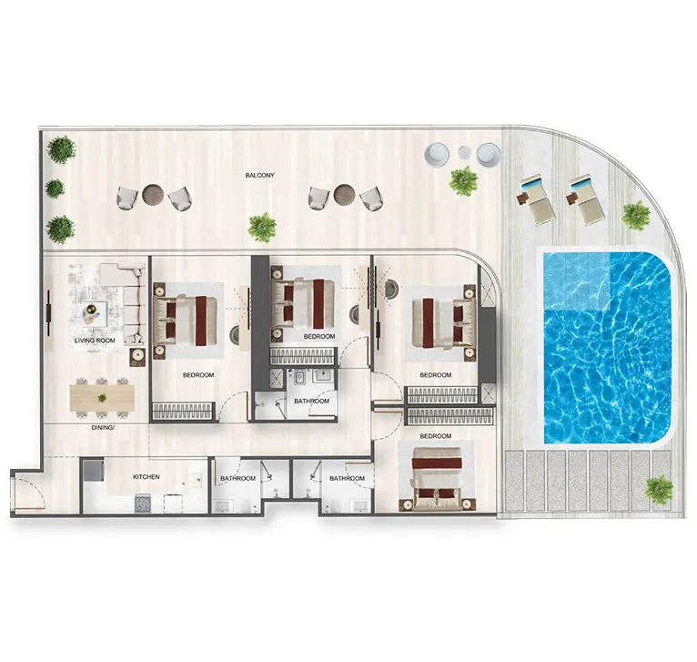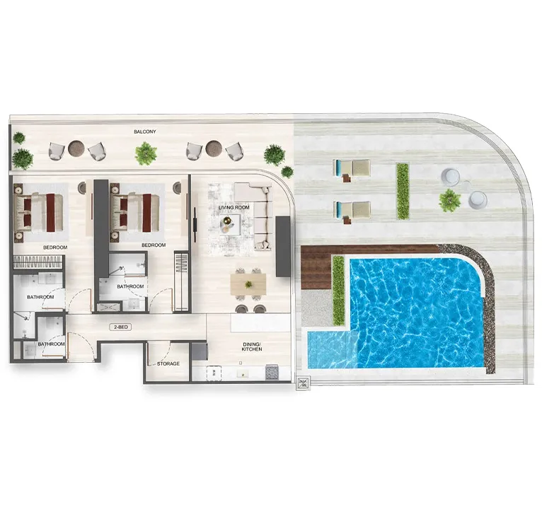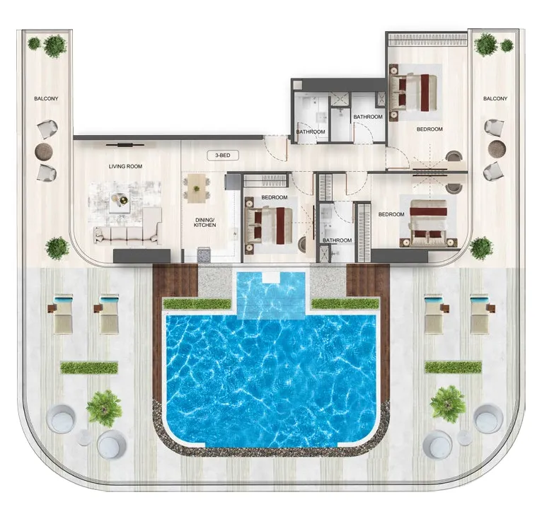 Ein visuell eindrucksvolles Pooldeck hoch über der Stadt mit Panoramablick. Einige Apartments verfügen zudem über private Pools auf den Sky Terraces – ein Boutique-Resort-Erlebnis zu Hause.