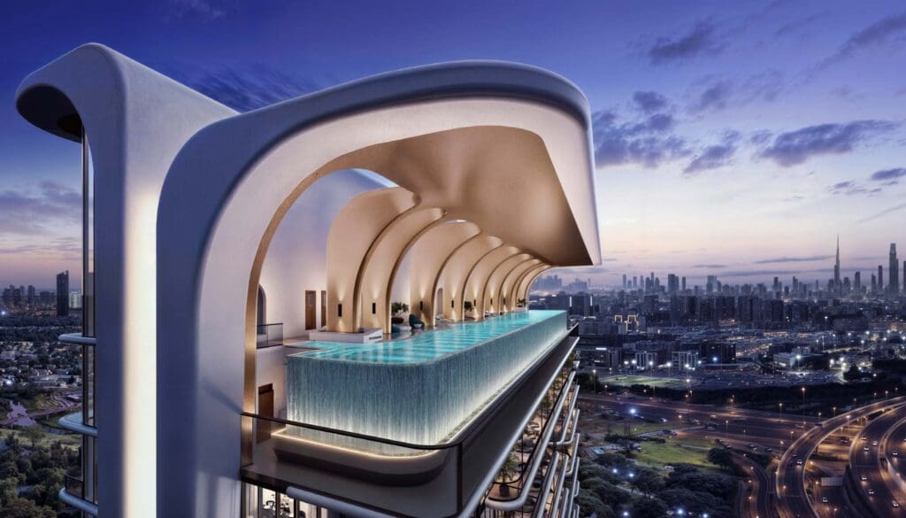Velos Residence verfügt über einen spektakulären Infinity-Pool auf dem 33. Stockwerk mit atemberaubendem Panoramablick auf die Skyline Dubais und das üppige Grün von Motor City.