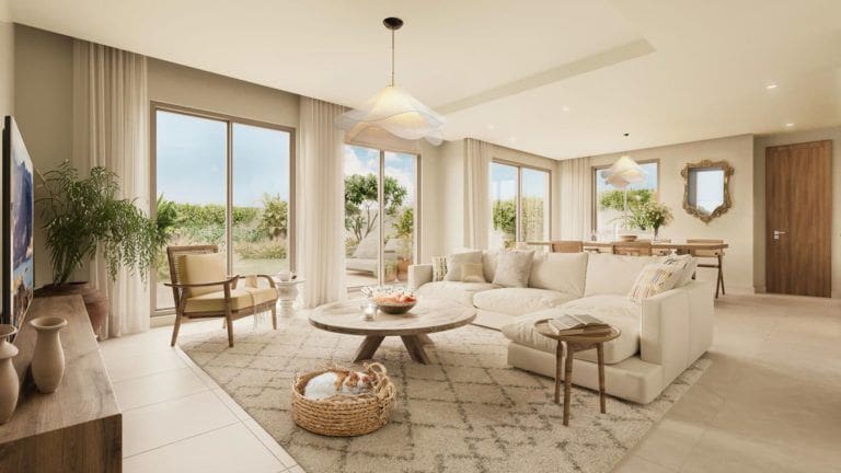 Bloom Living Olvera umfasst 288 exklusive Wohneinheiten, darunter Stadthäuser mit 2 bis 3 Schlafzimmern und einer Größe zwischen 120 m² und 227 m². Für die Ausstattung wurden umweltfreundliche Materialien gewählt - Naturholz, kunstvoll gemusterter Marmor und hochwertige Armaturen. Die Inneneinrichtung ist in hellen Sand-, Creme-, Pfirsich-, Beige- und Perlmutt-Tönen gehalten.