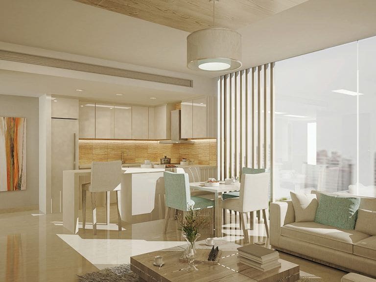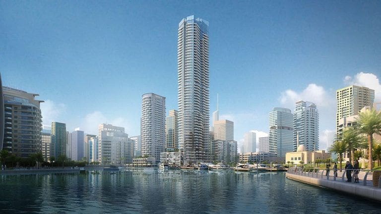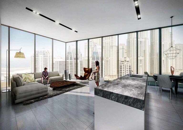 Bloom Stella Maris, Dubai Marina. This is a 52-storey residential complex in the form of a single tower. The total number of residential premises is 313, among which there are penthouses. The bulk of the apartments range in size from 748 to 2,514 square feet, with the number of bedrooms ranging from 1 to 4. The large windows in the rooms offer beautiful views of the Arabian Gulf, and the amenities and infrastructure around can’t be beaten. The starting price for these apartments is AED 998,000 (USD 271,700).