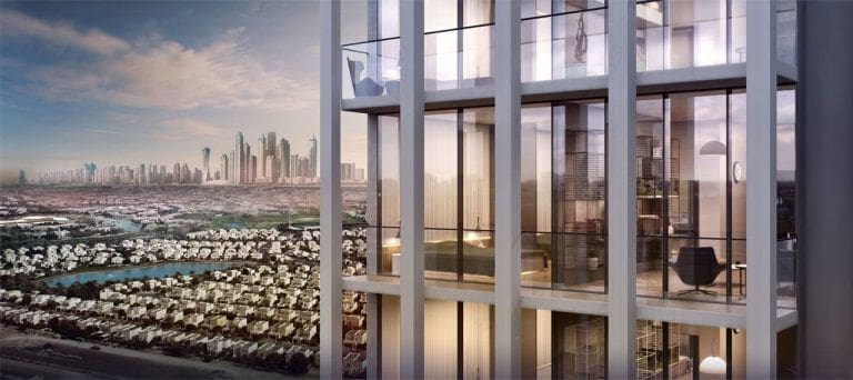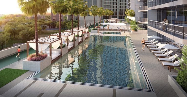 Bloom Towers, Jumeirah Village Circle. A residential complex consisting of three high-rise towers with 689 units. Tenants and buyers are offered a full range of amenities: theaters, a sauna, a swimming pool, secure parking, concierge services and premium finish rooms. The surrounding area is landscaped and the proximity to the Emirates Hills, as well as Dubai Marina makes this a great location. one-bedroom apartments range from 564 to 750 square meters with 1-3 bedrooms, and there are also studios from 37 square meters. Prices start from AED 422,400 (USD 115,000)