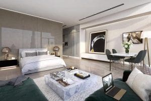 Seven Palm Residences, in Palm Jumeirah. This is a luxury project of two towers connected by a large bridge. The developer offers studios, and apartment buildings with a stylish finishing. The number of bedrooms in these residences ranges from 1 to 3. Also available for sale are one-bedroom apartments with fitted kitchens and wonderfully large windows. Prices start from AED 649,888 (USD 176,900).