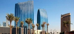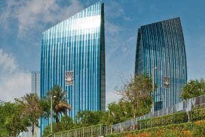 Boulevard Plaza Towers is a multifunctional complex consisting of two towers. The project has been implemented by the developer Emaar Properties. The office buildings have been in operation since 2010. The architectural idea is by Aedas Limited. The towers include 30 and 37 floors and are 141 and 168 meters high respectively. The design of the buildings is dynamic: they are pointing towards the sky. Each building tapers upwards in the form of a lancet arch. The curved walls are made of glass with reflective blue and neutral films. The glass and concrete business center is in keeping with the futuristic style of the building.