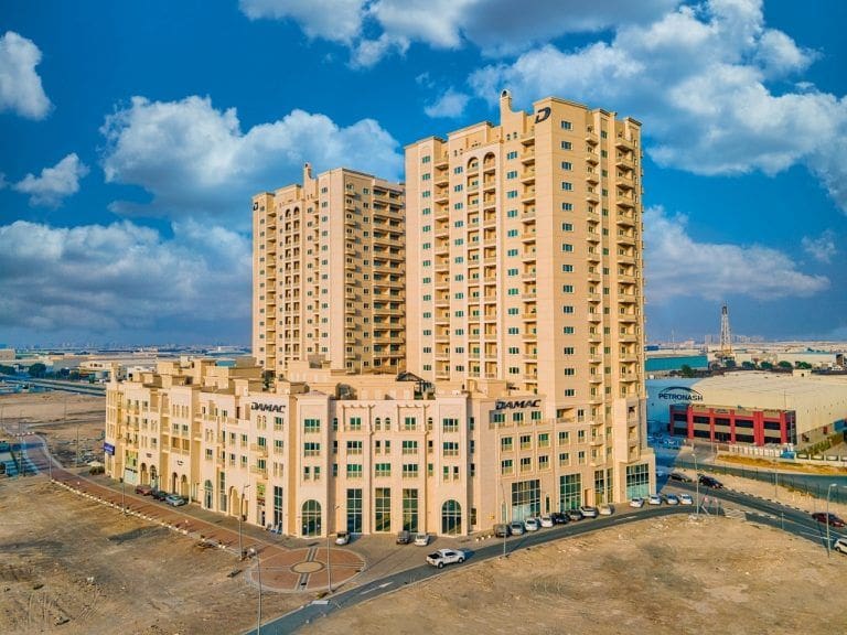 Suburbia is a premium hotel that consists of two high-rise buildings that are adjoined by townhouses built in a Moroccan style. As of today, this project is finished and features hotel apartments with two and three bedrooms for sale with living areas of 1,304 sq. ft. and 1,625 sq. ft. respectively. These units cost in the range of AED 1,454,000 to AED 1,304, 000 (about USD 395,900 to USD 355,100). All apartments are equipped with a fully fitted kitchen as well as household electronics and come fully furnished.