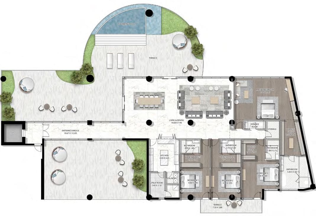 Every single property will include a private terrace, where occupants will be able to relax in their own private swimming pool. As well as that, terraces will feature hydroponic walls, which are now highly popular in upscale developments across the world. For an elegant look, the bathrooms and the bedrooms will be separated by a mirror wall, and there will be a TV panel installed in the bathrooms.