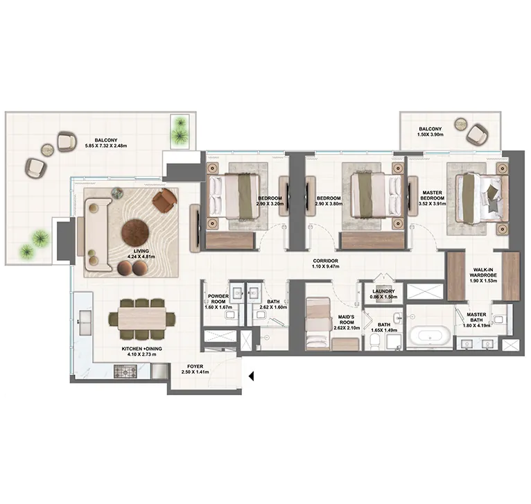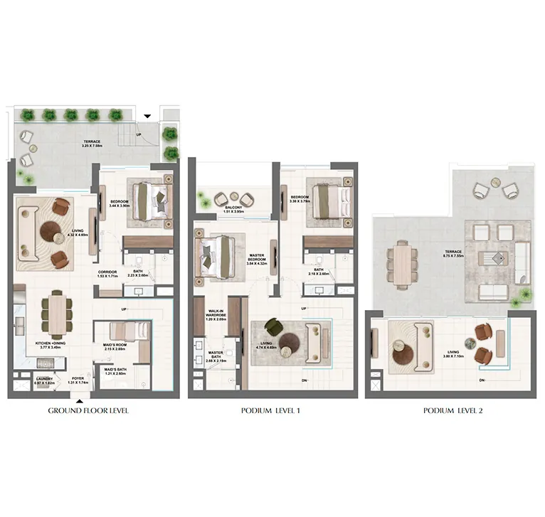 Apartment prices in Silva DCH start from AED 1.79M (USD 488K) for a 1-bedroom unit, AED 2.65M (USD 721K) for a 2-bedroom unit, and AED 3.87M (USD 1M) for a 3-bedroom unit. The 3-bedroom townhouses are available from AED 6.3M (USD 1.7M)
