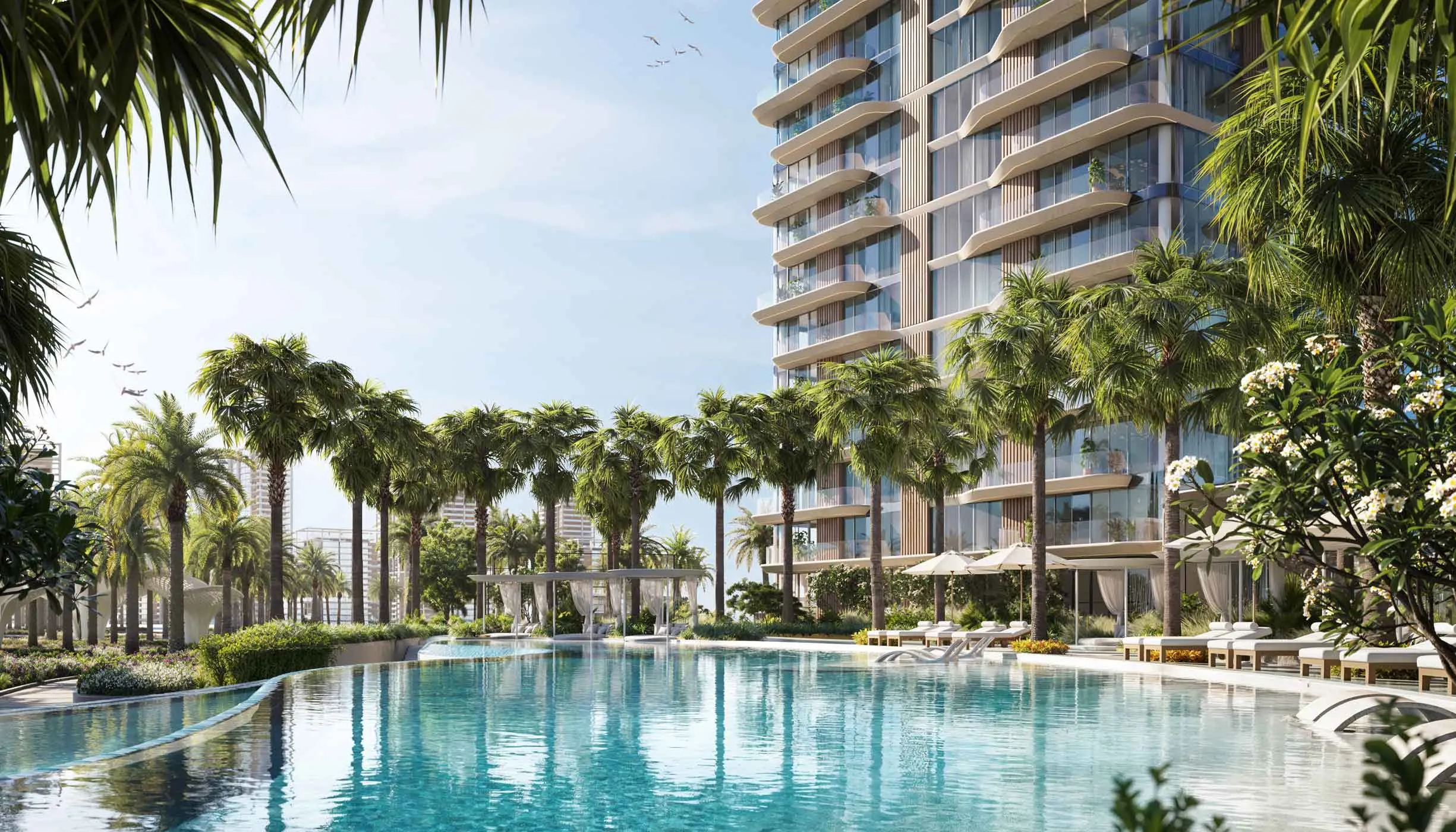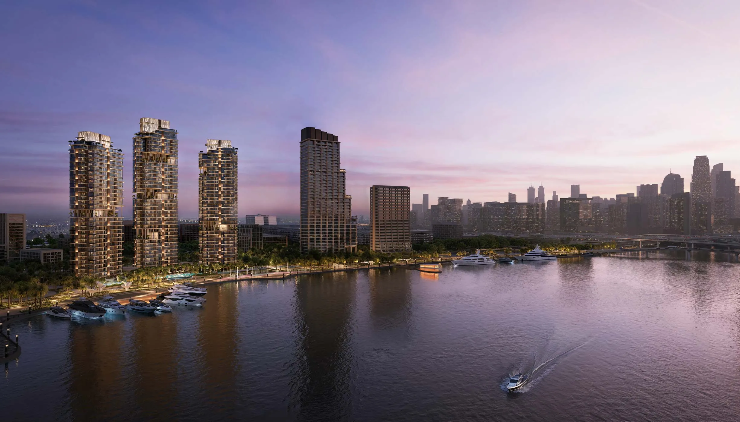 The development offers 1–4BR apartments and three 5-bedroom penthouses with private pools, double-height living spaces, and waterfront views.