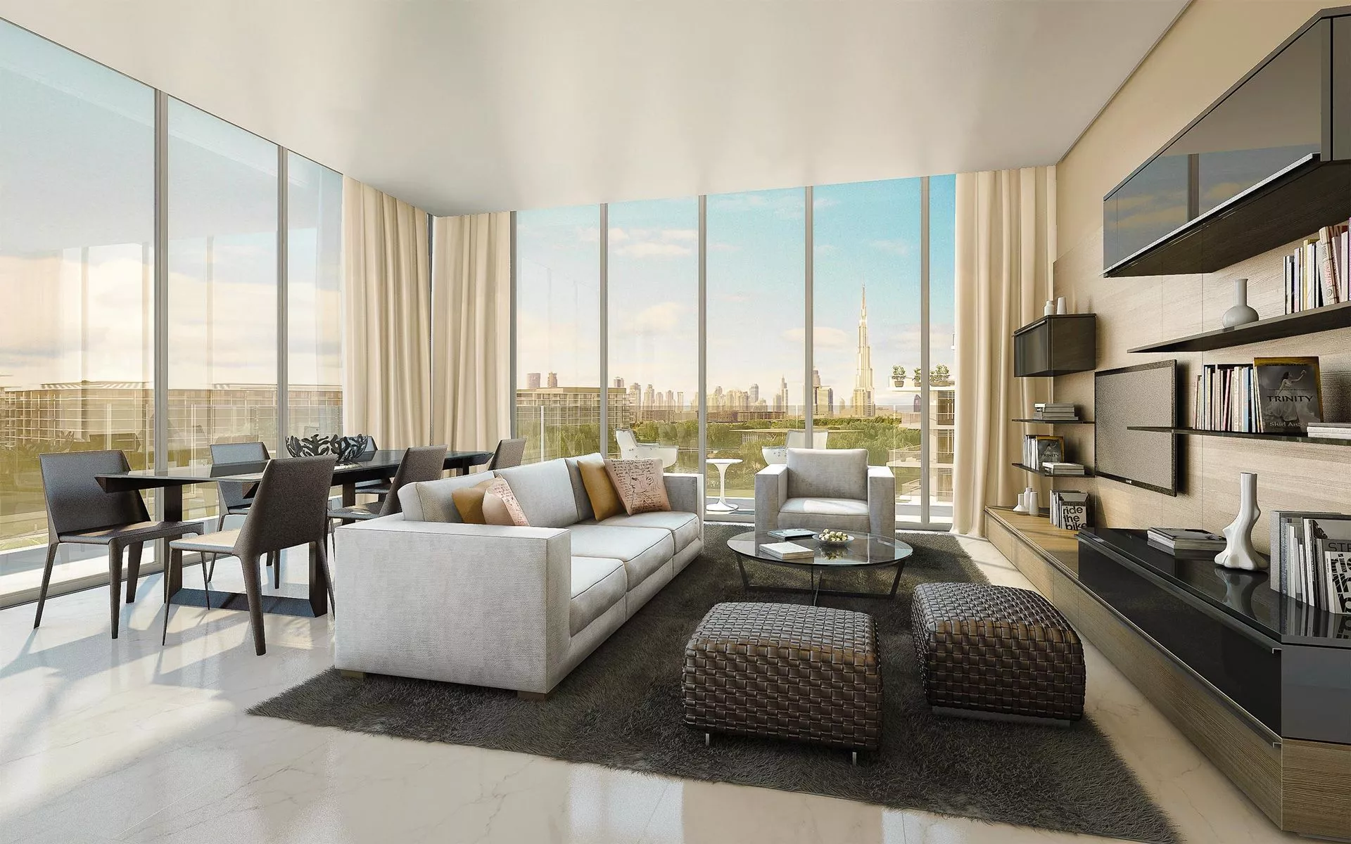 Residential units are equipped with panoramic windows overlooking the patio or Dubai Hills Park. The park has jogging, cycling paths, sports fields, a children’s water park and an outdoor skating rink.