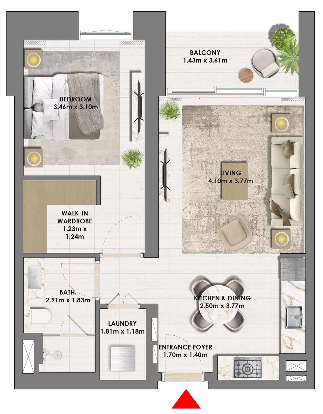 The starting cost for 1-bedroom properties is AED 1.6M (USD 435K).